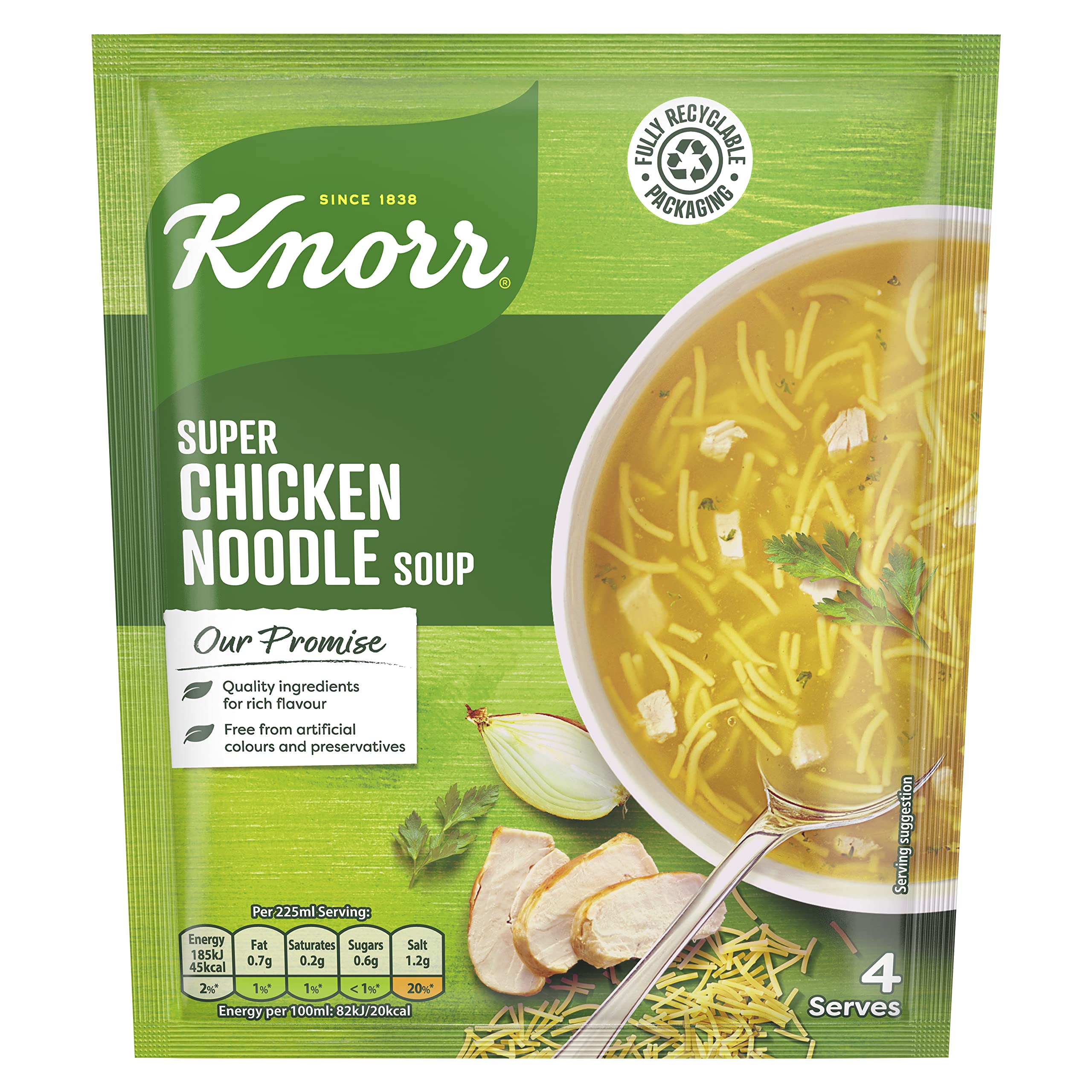 Treat your taste buds with Knorr Super Chicken Noodle Soup Mix. Our Knorr chefs have created this delicious soup with a selection of our finest ingredients. Staples of the kitchen cupboard, our Packet Soups are as tasty as they are versatile. Perfect for lunch, dinner, or whenever you feel like a simple, tasty treat in a bowl. Knorr Super Chicken Noodle Soup Mix is free from artificial colours and preservatives, making it an excellent choice for creating a family-favourite meal. This packet soup is a real crowd-pleaser with children and grown-ups alike. Preparation Method: 1. Bring 900 ml of water to the boil. Empty the soup packet contents into the boiling water. Stir well with a whisk or fork. 2. Reduce heat and simmer for five minutes, stirring occasionally. 3. Serve enjoy! If you like Knorr Super Chicken Noodle Soup Mix, try one of our other soups such as Chicken and Leek or Florida Spring Vegetable. At Knorr, we source high-quality ingredients to create delicious stocks, gravies, soups, and seasonings enjoyed by families across the world. Our Knorr chefs believe that great-tasting and high-quality ingredients come from a conscious use of agricultural resources. Great Taste is in our Nature! To learn more, please visit our website. INGREDIENTS Ingredients: Pasta (64 ) (durum WHEAT semolina, WHEAT (flour) flavourings (contain CELERY), iodised salt,chicken(4.6 ) [chicken, vegetable oil (palm), salt,antioxidants(ascorbyl palmitate, alpha-trapherol)]. starch, yeast extract, chicken fat (2,5 )(chicken fat, antioxidant (extracts of rosemary)],toasted onion powder (2 ), potassium chloride, sugar, salt, spices (CELERY seeds, turmeric, pepper),parsley. May contain EGG, MILK, MUSTARD, SOY AND OTHER CEREALS CONTAINING GLUTEN. 'Sustainably grown DIRECTIONS Preparing Method: 1. Bring 900ml of water to the boil. 2. Empty contents of sachet into the boiling water. Stir well with a whisk or fork. 3. Reduce heat and simmer for 5 minutes, stirring occasionally. 4. Serve enjoy! SAFETY WARNING Preparing Method: 1. Bring 900 ml of water to the boil. 2. Empty contents of sachet into the boiling water. Stir well with a whisk or fork. 3. Reduce heat and simmer for 5 minutes, stirring occasionally. 4. Serve and enjoy. MANUFACTURER CONTACT INFORMATION Unilever UK, Knorr, Freepost ADM 3940, London, SW1A 1YR. Unilever Ireland, Citywest, Dublin 24. See moreFor a heartier soup, add your favourite veggies. Knorr is in partnership with sustainable agriculture meaning a great taste and high-quality ingredients that go into our stocks, gravies, soups and seasonings. Knorr Super Chicken Noodle Soup Mix is free from artificial colours and preservatives. Simply bring 900 ml of water to the boil, add the contents of the sachet, stir and simmer, then enjoy this delicious, warming soup. Great taste is in our nature, and this packet soup has been created with chicken and oodles of noodles. Knorr Super Chicken Noodle Soup Mix is a tasty and versatile soup that is fast to prepare in just 5 minutes.