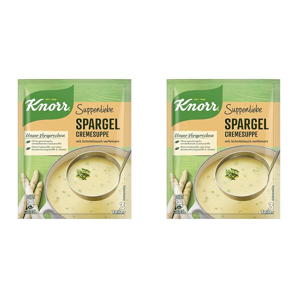 Ingredients / ingredients Ingredients: palm oil, potato thickness, wheat flour, iodized dining salt, sugar, 4% asparagus³, yeast extract, glucose syrup, milk protein, table salt plugs4, dining salt, 0.5% chives³, lemon juice powder, flavors, curcuma³.³ from sustainable cultivation 4 gone from natural potassium minerals can contain traces of egg, celery and mustard. Instructions 1) Stir in the bag content with a whisk in 0.75 l (750 ml).2) Let it boil for 5 minutes over low heat.Stirring occasionally.the many different finished soups from Knorr offer the right dish for every taste and are quickly and easily prepared.The content of the Knorr soup love asparagus cream soup is sufficient for 750 ml (3 plates).Knorr vegetable soup, of course, without flavor enhancing additives and without dyes.Gently dried vegetables, herbs and spices give the soup an aromatic and light taste.Knorr soup love asparagus cream soup is a creamy vegetable soup with high -quality and gently dried ingredients.Knorr soup love asparagus cream soup is refined with a delicious asparagus cream soup with chives.The following information applies to each unit per pack. INHALTSSTOFFE / ZUTATEN Zutaten: Palmöl, Kartoffelstärke, WEIZENMEHL, jodiertes Speisesalz, Zucker, 4% Spargel³, Hefeextrakt, Glukosesirup, MILCHEIWEISS, Kochsalzersatz4, Speisesalz, 0,5% Schnittlauch³, Zitronensaftpulver, Aromen, Curcuma³. ³ aus nachhaltigem Anbau 4gewonnen aus natürlichen Kaliummineralien Kann Spuren von Ei, Sellerie und Senf enthalten. GEBRAUCHSANWEISUNG 1) Beutelinhalt mit einem Schneebesen in 0,75 l (750 ml) kochendes Wasser einrühren. 2) Bei schwacher Hitze 5 Minuten kochen lassen. Ab und zu umrühren.Die vielen verschiedenen Fertigsuppen von Knorr bieten für jeden Geschmack das passende Gericht und sind schnell und einfach zubereitet. Der Inhalt der Knorr Suppenliebe Spargelcreme Suppe reicht für 750 ml (3 Teller). Knorr Gemüsesuppe natürlich ohne geschmacksverstärkende Zusatzstoffe und ohne Farbstoffe. Schonend getrocknetes Gemüse, Kräuter und Gewürze verleihen der Suppe einen aromatischen und leichten Geschmack. Knorr Suppenliebe Spargelcreme Suppe ist eine cremige Gemüsesuppe mit hochwertigen und schonend getrockneten Zutaten. Knorr Suppenliebe Spargelcreme Suppe ist eine leckere Spargelcremesuppe mit Schnittlauch verfeinert. Die folgenden Informationen gelten für jede Einheit pro Packung.Knorr Suppenliebe Spargelcreme Suppe, 1 x 3 Teller (1 x 750 ml) (Packung mit 2) Spargelcreme 750 ml (2er Pack)