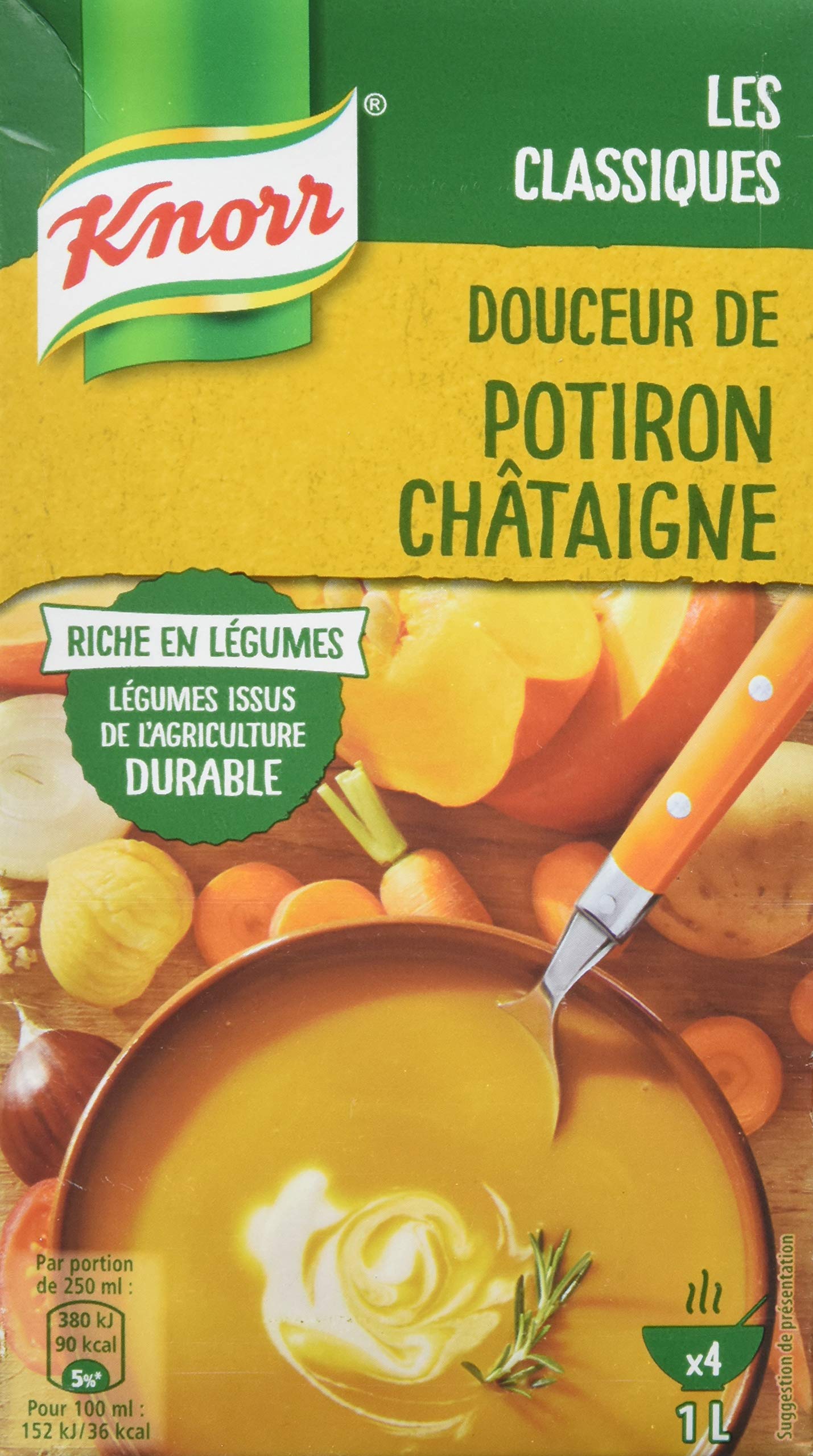 Warm up with this creamy pumpkin treat that Knorr chefs have enhanced with chestnuts for even more flavor! INGREDIENTS Ingredients: water, vegetables: 45 (pumpkin 22 , carrot, potato, onion, tomato), rehydrated chestnut: 4.1 , CREAM, salt, BUTTER, sugar, HAZELNUTS, flavors (including BARLEY), fructose, maltodextrin, balsamic vinegar (wine vinegar, grape must), white wine extract. May contain: celery, mustard, egg. vegetables from sustainable agriculture DIRECTIONS FOR USE PREPARATION TIPS: IN A CASSEROLE: 1. Shake the brick before opening it then pour the soup into a saucepan. 2. Reheat over low heat without bringing to a boil and stir occasionally. IN THE MICROWAVE OVEN: Pour the soup into a suitable container then reheat for a few moments. NO NEED TO SALT. DISCLAIMER Non-contractual photography. The above indications are given for information purposes. They are not necessarily exhaustive and cannot replace the information appearing on the product packaging which alone is authentic, and to which you are invited to refer, particularly in the event of food intolerance. No artificial colors or flavor enhancers. Pumpkin from sustainable agriculture. 1L. Réchauffez-vous avec cette onctueuse douceur de potiron que les chefs Knorr ont agrémenté de châtaignes pour encore plus de saveur ! INGRÉDIENTS Ingrédients : eau, légumes : 45 (potiron 22 , carotte, pomme de terre, oignon, tomate), châtaigne réhydratée : 4,1 , CREME fraîche, sel, BEURRE, sucre, NOISETTE, arômes (dont ORGE), fructose, maltodextrine, vinaigre balsamique (vinaigre de vin, moût de raisin), extrait de vin blanc. Peut contenir : céleri, moutarde, œuf. légumes issus de l'agriculture durable MODE D'EMPLOI CONSEILS DE PRÉPARATION : À LA CASSEROLE : 1. Secouer la brique avant de l'ouvrir puis verser la soupe dans une casserole. 2. Réchauffer à feu doux sans porter à ébullition et remuer de temps en temps. AU FOUR MICRO-ONDES : Verser la soupe dans un récipient adapté puis réchauffer quelques instants. INUTILE DE SALER. CLAUSE DE NON-GARANTIE Photographie non contractuelle. Les indications ci-dessus sont données à titre d'information. Elles ne sont pas forcément exhaustives et ne sauraient se substituer aux informations figurant sur l'emballage du produit qui font seules foi, et auxquelles vous êtes invités à vous reporter, notamment en cas d'intolérance alimentaire. Sans colorant, sans exhausteur de goût. Potiron issu de l'agriculture durable. 1l.