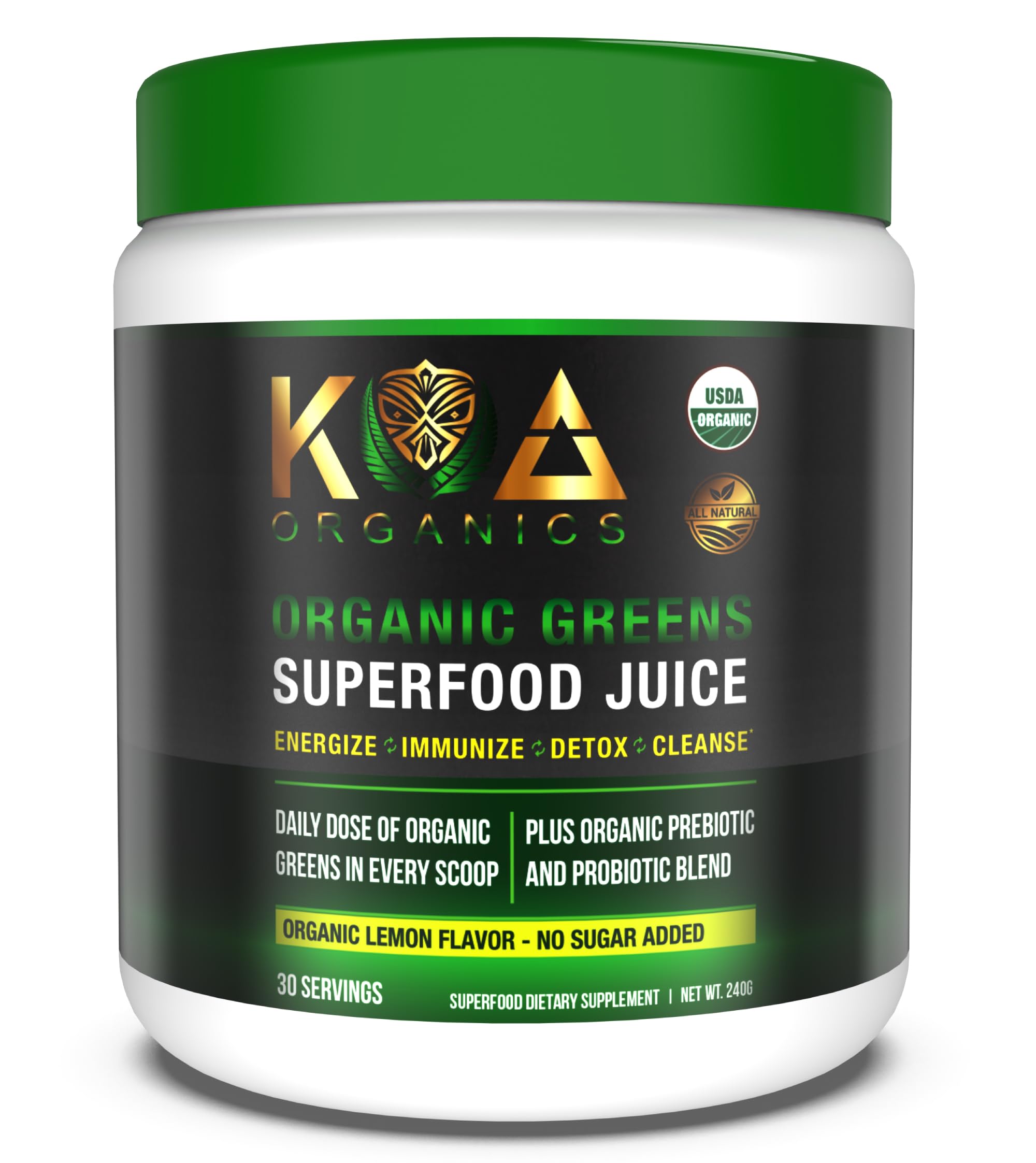 Your effortless green fix! Crafted to offer the perks of daily juicing (minus the fuss), KOA Organic Green Juice is the simplest, most delicious route to get all your superfoods in 1 easy glass a day. Achieving the sheer volume of superfoods in these organic greens from diet alone would be a tall order. In one scoop, you'll harness the power of over 15 superfoods – a blend of detoxifying greens, fruits rich in antioxidants, potent mushrooms and herbs, and beneficial probiotics. All designed to aid digestion, promote detoxification, and boost energyQuality You Can Trust: KOA Organics superfood powder is certified organic, vegan, non-gmo, dairy free, gluten free, and made with no whole grass fillers and no preservatives. Whole Food Nourishment: Our green supplement delivers natural antioxidants, enzymes, amino acids, essential fatty acids, and a plethora of other phytonutrients from whole foods. Gut Health Boost Detox : Aids in optimal digestive function, detox, sustained energy, and reduces occasional discomforts like gas bloating. Promotes a balanced gut ecosystem with chlorella, spirulina, wheat grass, barley grass, ashwagandha, and additional adaptogenic herbs. Powerful Certified Organic Superfoods Formulation: Potent, nutrient-filled super greens powder. Every scoop packs ingredients like ashwagandha, spirulina, matcha, wheat grass, moringa, chollerla, plus probiotics, digestive enzymes, matcha powder, and adaptogenic herbs for easy nutrition and more in a convenient organic, non-gmo gluten-free blend. Get Your Daily Dose of Organic Greens Easily: All your essential superfoods in a scoop, offering natural energy, detox, and boosting immunity. Add to water or a smoothie – no shopping, blending, or cleanup needed.