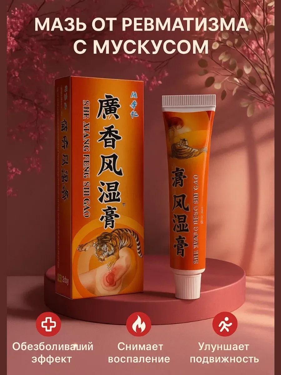 Мазь от ревматизма с мускусом — это эффективное наружное средство, созданное по традиционным рецептам с использованием природных компонентов, направленное на снятие боли, уменьшение воспаления и улучшение подвижности суставов и мышц. Благодаря особой формуле с мускусом и растительными экстрактами, мазь глубоко проникает в ткани, улучшая кровообращение и ускоряя восстановительные процессы. Средство рекомендуется при болях в спине, шее, плечах, коленях, а также при травмах, ушибах, растяжениях и ощущении тяжести в конечностях. Лёгкая текстура мази быстро впитывается, не оставляя жирных следов, а мягкое согревающее действие способствует расслаблению мышц и устранению чувства дискомфорта. Регулярное применение помогает при хронических болях, связанных с ревматизмом, артритом, остеохондрозом и другими воспалительными заболеваниями опорно-двигательного аппарата. Мазь также полезна спортсменам и людям, ведущим активный образ жизни, для восстановления после физических нагрузок и предупреждения травм. Удобная туба позволяет легко дозировать средство и наносить его на проблемные участки кожи. Приятный травяной аромат делает процедуру комфортной и ненавязчивой. Подходит для использования дома и в путешествиях. Хранить в сухом месте, защищённом от прямых солнечных лучей. Это средство станет незаменимым помощником для тех, кто ценит натуральный уход, эффективное снятие боли и быстрое восстановление подвижности, обеспечивая комфорт и лёгкость движений в любой ситуации.