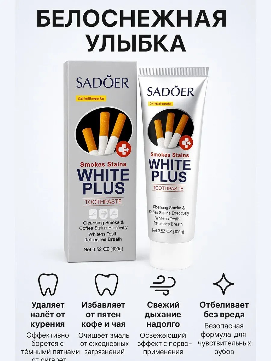White Plus Whitening Toothpaste is a modern, effective oral care product, specially designed for people who want to get rid of plaque and stains caused by smoking, coffee, tea, and other staining beverages. Its unique formula gently removes stubborn stains, restoring teeth's natural whiteness and shine without damaging the enamel. Active ingredients penetrate deep into microcracks on the tooth surface, dissolving plaque and preventing its recurrence, maintaining long-lasting results. Its mild mint aroma provides fresh breath all day long, eliminating unpleasant odors for a long time. Regular use of White Plus not only improves the appearance of your smile but also maintains the health of your teeth and gums, preventing tartar and cavities. It is suitable for daily use, does not cause sensitivity, and is safe for long-term use. The dense, creamy texture of this toothpaste spreads easily over teeth, creating a soft foam that effectively cleans even hard-to-reach areas. This product is an excellent choice for smokers, coffee and tea lovers, and anyone who wants to keep their teeth white and well-groomed. The convenient 100g packaging allows for economical use and makes it easy to take with you on the go or to work. White Plus combines whitening and healing effects, making daily dental care simple, enjoyable, and maximally effective. With this toothpaste, you can enjoy the confidence of your smile and fresh breath every day, and regular use will help achieve lasting whiteness and cleanliness, similar to a professional dental cleaning.
