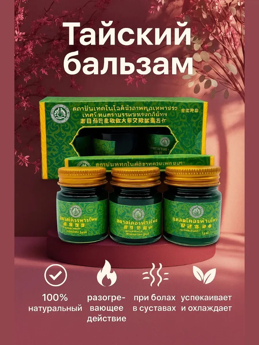 Тайский бальзам в баночках 15 мл 3 штуки в упаковке – это универсальное средство для ухода и поддержания здоровья кожи и мышц, созданное на основе традиционных восточных рецептов. Благодаря натуральным компонентам, он быстро впитывается, не оставляя жирного блеска, и оказывает выраженное разогревающее и расслабляющее действие. Такой бальзам идеально подходит для массажа, облегчения дискомфорта в мышцах и суставах после физических нагрузок, а также для профилактики переохлаждения в холодное время года. Компактная стеклянная баночка объёмом 15 мл удобна в использовании и хранении, её легко брать с собой в дорогу или на работу. Аромат эфирных масел оказывает мягкое успокаивающее воздействие, помогая снять усталость и напряжение. При регулярном применении бальзам улучшает микроциркуляцию, способствует быстрому восстановлению тканей и повышает эластичность кожи. Он подходит для точечного нанесения на проблемные зоны, в том числе на виски или переносицу при головной боли, а также для массажа стоп, спины и плеч. Средство можно использовать спортсменам, офисным работникам и людям, ведущим активный образ жизни, чтобы быстро снять усталость и вернуть лёгкость движений. Натуральный состав на основе растительных экстрактов делает бальзам безопасным для регулярного применения, а плотная крышка надёжно защищает содержимое от высыхания и утраты свойств. Это практичный и эффективный помощник в домашней аптечке, который объединяет целебные свойства природных масел и проверенные временем традиции восточной медицины, обеспечивая комфорт и заботу о вашем теле в любой ситуации.Содержит экстракты и масла из растений, таких как мята перечная, эвкалипт, гвоздичное масло, камфора, борнеол, метилсалицилат, салициловая кислота и другие натуральные компоненты.Показания к применению: