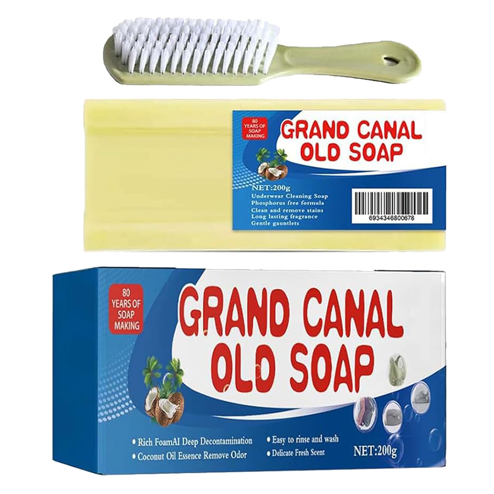 Easy to Use When washing particularly dirty clothes, you can easily remove the stain by applying soap to the stain, waiting a moment, and then washing the clothes as usual. Safe Soap Cleaning This underwear cleaning soap bar is free of harmful chemicals and will not harm your skin when washing clothes. Therefore, it can be used to wash underwear or baby clothes. Powerful Stain Removal This stain remover is easy to use and can be used to clean cotton, linen, synthetic fabrics, and other garments to remove milk stains, blood stains, food stains, etc. Natural Ingredients Grand Canal soap contains natural vegetable and animal fats, which are ideal for removing stains from clothes. Pleasant Experience Contains coconut oil, releases a fresh scent when used, and is ideal for handwashing. 200g, 2 pieces, includes a free brush.Savon de Nettoyage au Parfum Durable,Puissant Détachant en Barre de Savon de Nettoyage,Barre de Savon à Lessive,Savon Anti-Taches pour la Protection des Mains,Savon de Nettoyage Sous-Vêtements,2PCFacile à utiliser Lorsque vous lavez des vêtements particulièrement sales, vous pouvez facilement enlever la tache en appliquant du savon sur la tache, en attendant un moment, puis en lavant les vêtements normalement. Nettoyage au savon sûr le pain de savon pour nettoyer les sous-vêtements est exempt de produits chimiques nocifs et ne nuira pas à votre peau lors du lavage des vêtements. Par conséquent, il peut être utilisé pour laver les sous-vêtements ou les vêtements de bébé. Élimination des taches puissantes Le détachant est facile à utiliser et peut être utilisé pour nettoyer le coton, le lin, les tissus synthétiques et d'autres vêtements afin d'éliminer les taches de lait, les taches de sang ou les taches de nourriture, etc. Ingrédients naturels Le savon Grand Canal contient des graisses végétales et animales naturelles, qui sont idéales pour éliminer les taches sur les vêtements. Expérience agréable Contient de l'huile de noix de coco, dégage un parfum frais lorsqu'il est utilisé et est plus adapté au lavage des mains. 200 g, 2 pièces, envoyez une brosse en cadeau.