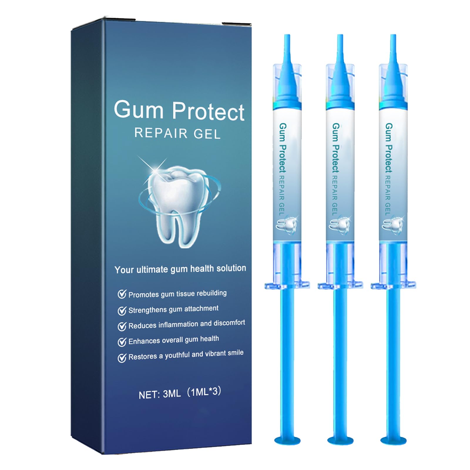 Easy to use: Our gel is designed for ease of use, allowing you to precisely apply the formula to your teeth. Enjoy the comfort of an even, mess-free coating that makes oral care easy and comfortable. Teeth whitening: After using our gum treatment gel, you'll notice your teeth become whiter and you achieve a brighter smile. Safe ingredients: Our gel is formulated with a safe and gentle formula to ensure soothing and gentle care. Restore gum health: By using the gel, you can reduce gum discomfort and promote overall gum health. Gum treatment gel: Our gum treatment gel delivers rich nutrients directly to the gum tissue for fast and effective absorption, promoting optimal gum health.