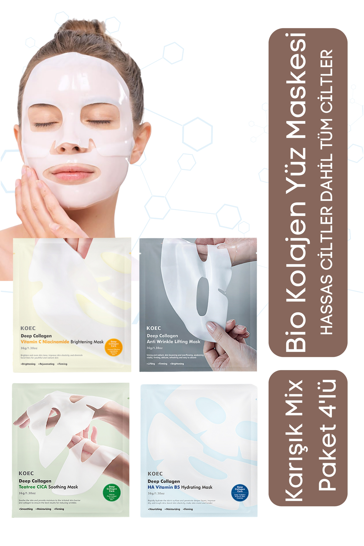 ThisDeep Collagen Skincare Mask Collection, which contains Korean beauty secrets, offers all the nourishing and soothing ingredients you need in your skin care. Formulated with skin-friendly ingredients such asCollagen,Vitamin C,Niacinamide,Hyaluronic AcidandCICA, these masks offer many benefits such asdeep hydration,lightening,tighteningandskin soothing. This mask collection is all you need to make your skinanti-aging,smoothandradiant. Suitable for all skin types, these masks are a perfect solution especially forsigns of aging,dark spots,drynessandsensitive skin.
