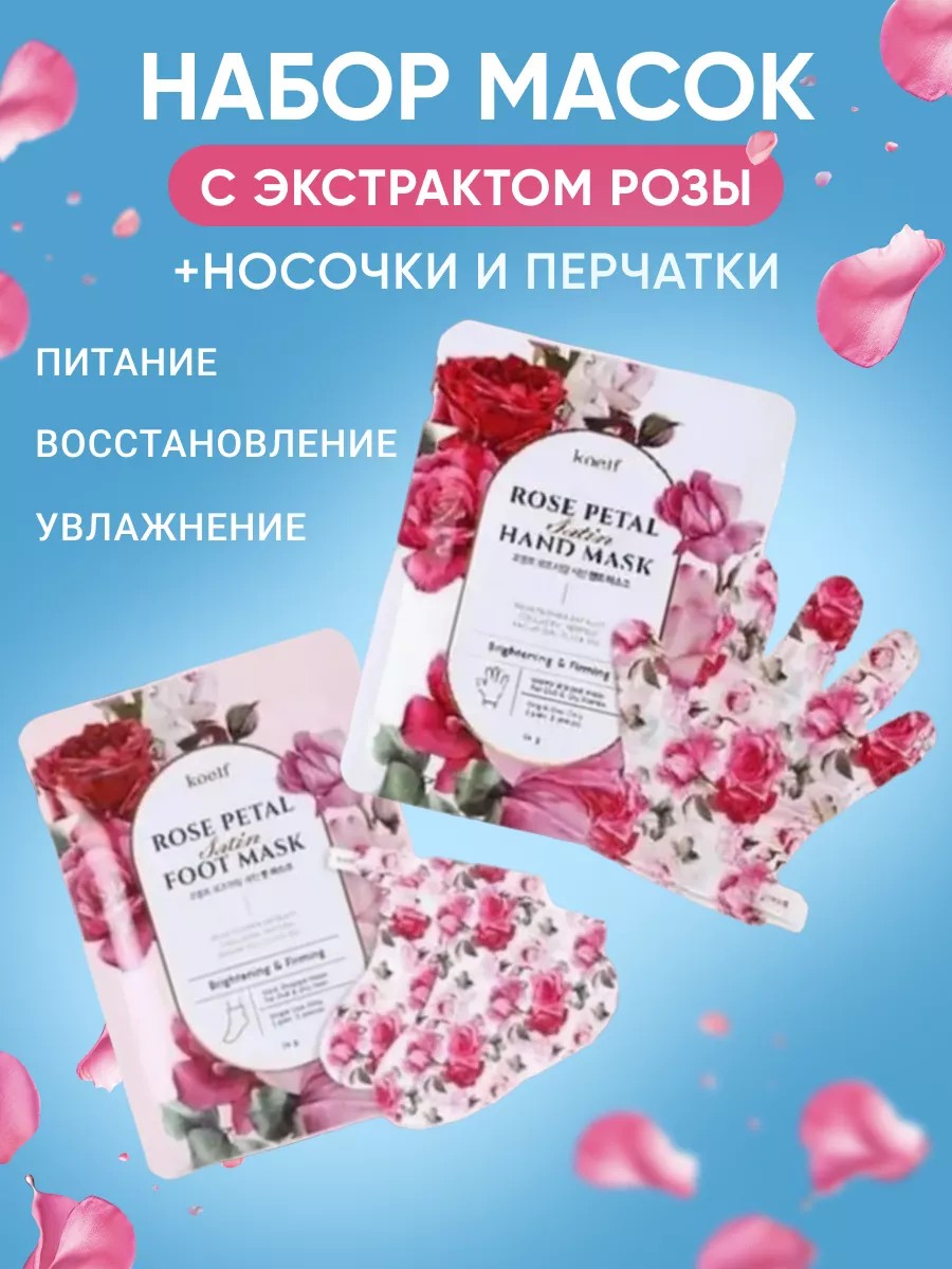 Маска с экстрактом розы набор носочки + перчатки Koelf Petal Mask. Маска обеспечивает питание и восстановление сухой потрескавшейся кожи. В состав маски входит экстракт розы, который способствует регенерации кожи и заживлению мелких трещинок, увлажняет и успокаивает чувствительную кожу, снимая усталость и напряжение.
