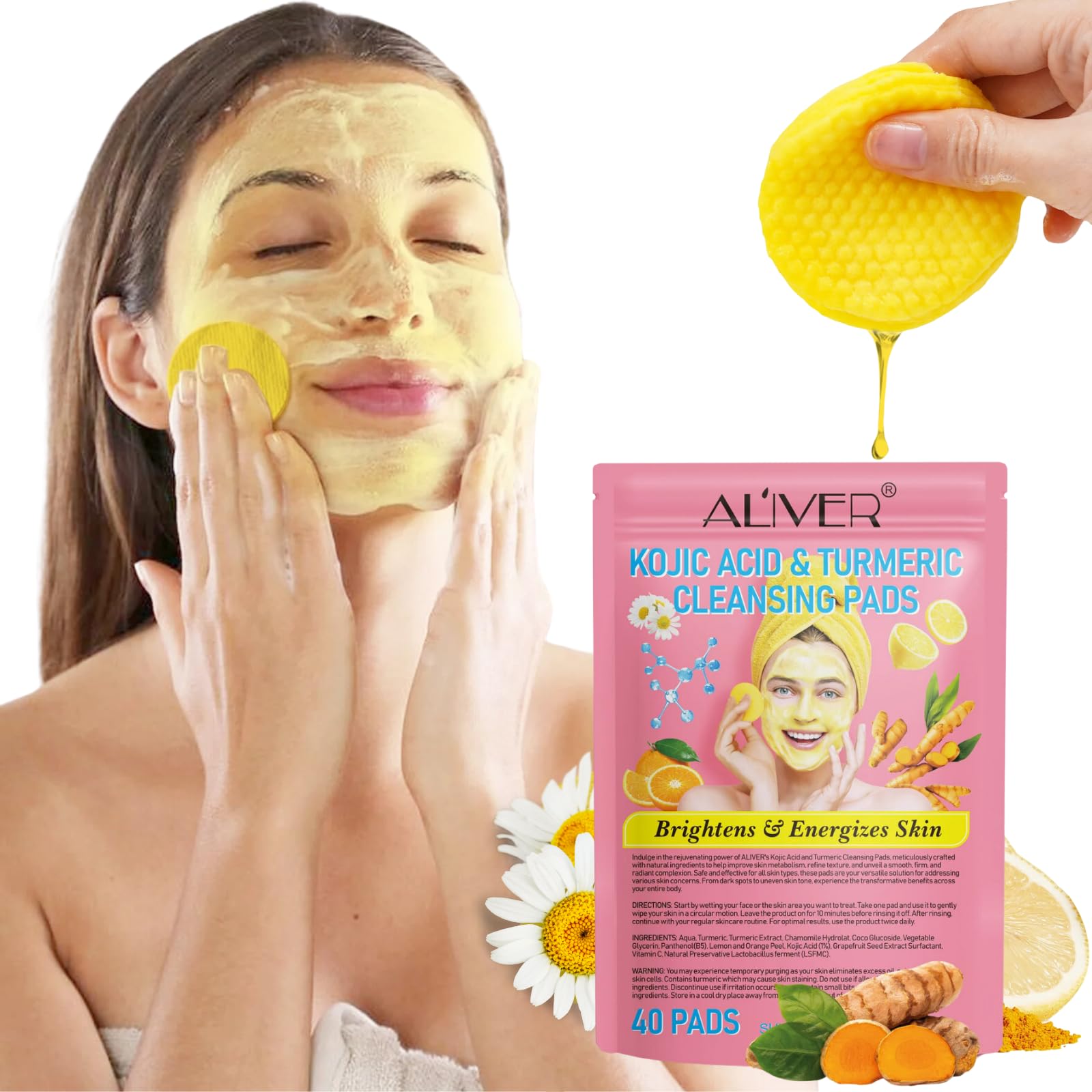 Kojic Acid and Turmeric Cleansing Pads for Dark Spots, Turmeric Kojic Acid Cleansing Pads for Face & Body with Vitamin B5, Exfoliating Cleansing Pads for All Skin Types Our turmeric kojic acid cleansing pads are perfect for targeting dark spots and achieving a radiant complexion. These kojic acid and turmeric pads provide gentle exfoliation, making them ideal for daily use on the face. Experience the combined benefits of turmeric and kojic acid with these convenient glow up pads, designed to cleanse, soothe, and revitalize your skin.[ Turmeric Cleansing Pads for Face ]: Our turmeric cleansing pads for the face provide a convenient and effective solution for daily skincare routines. These pads are pre-moistened, making it easy to incorporate the antioxidant benefits of turmeric into your skincare regimen. They help to cleanse, exfoliate, and soothe the skin, promoting a clearer, more vibrant complexion. [ Glow Up Pads - Turmeric & Kojic Acid Pads ]: Brighten and rejuvenate your skin with our glow up pads, including water, turmeric, turmeric extract, chamomile hydrolat, lemon, and orange peel, Panthenol(B5), kojic acid (1%), and vitamin C. These pads are designed to cleanse, exfoliate, and brighten your complexion, reducing the appearance of dark spots and promoting a more youthful, radiant glow. Toss them in your purse or gym bag for easy access to a quick skincare refresh anytime, anywhere. [ Turmeric Exfoliating Pads ]: Achieve a smoother, fresher complexion with our turmeric exfoliating pads. The dual-sided turmeric face pads feature a microfiber side that gently buffs away dead skin cells, while the other side soothes and calms the skin. These tumeric pads are ideal for all skin types, providing a gentle yet effective exfoliation that leaves your skin feeling soft and revitalized. [ Kojic Acid and Turmeric Cleansing Pads ]: Experience the combined benefits of kojic acid and turmeric with our cleansing pads. These pads deeply cleanse pores, and remove dirt, oil, and makeup without stripping away essential moisture. They are perfect for daily use, helping to reduce the appearance of dark spots and promote a clearer, more even complexion. [ Turmeric Cleansing Pads for Dark Spots ]: Our kojic acid and turmeric cleansing pads are designed to effectively target dark spots. Infused with natural ingredients like turmeric and kojic acid, these pads help to brighten your complexion and even out your skin tone. They gently exfoliate, removing dead skin cells and impurities, leaving your skin smooth, refreshed, and radiant.