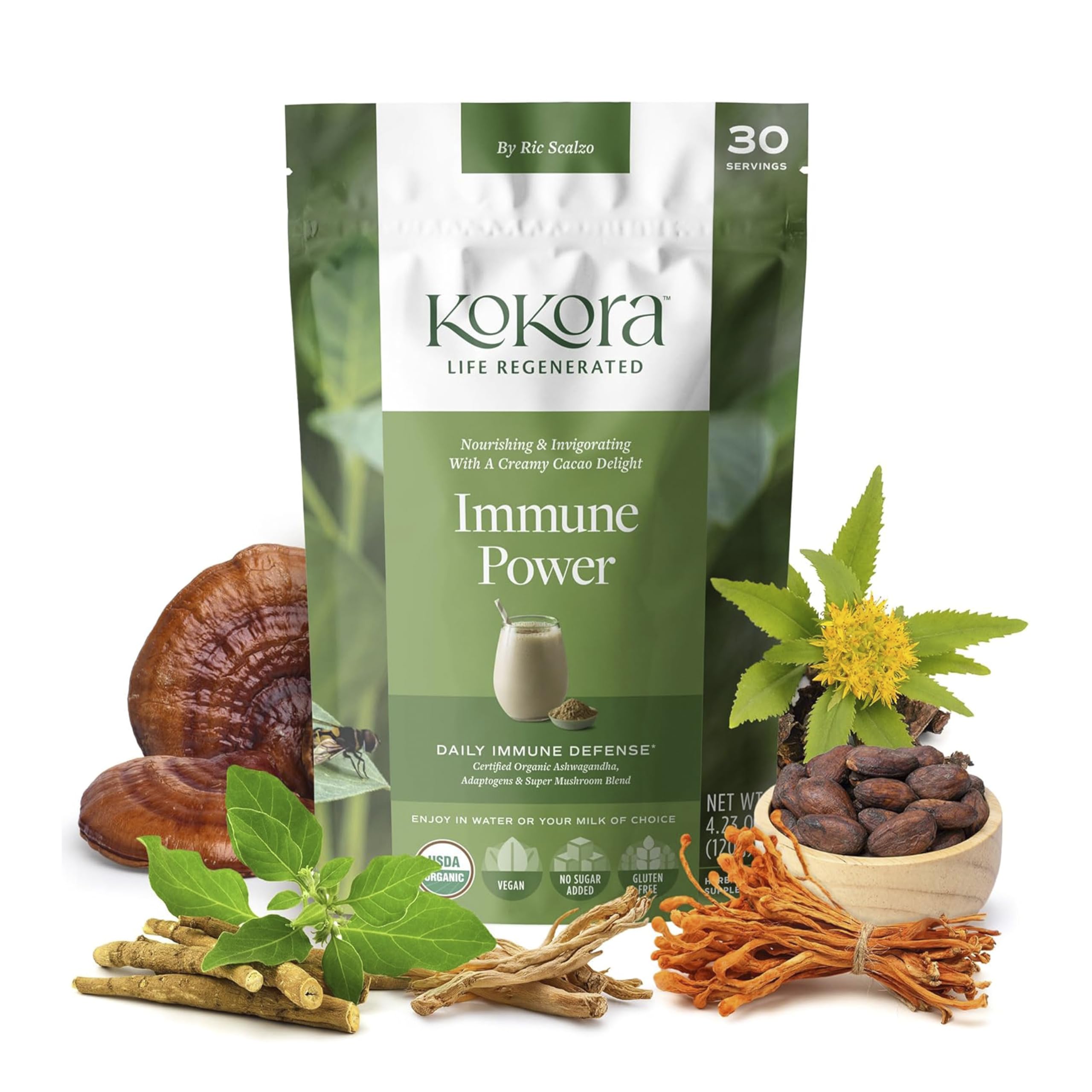 Kokora Life Regenerated - Rooted in Soil. Powered by Plants. Backed by Science. At Kokora, we believe in a future where personal and environmental wellness are aligned. Where regenerative farming nourishes the soil and our herbs nourish your health. 100 of the ingredients in Kokora Immune Power are Certified Organic and several ingredients are Regenerative Organic Certified. Our mission is to create the very finest herbal remedies fostering health vitality for us all. Help your immune defenses with this adaptogens super mushroom blend. Nourishing Invigorating with a Creamy Cacao Delight. Kokora offers the nutrient rich and natural properties of Rhodiola Root, Ashwagandha, Maca Root, Ginger Root, Chaga, Reishi, and Monk Fruit for a flavorful and nutritious blend.