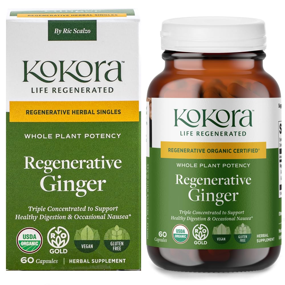 kokora Regenerative Ginger - Regenerative Organic Certified Ginger Root Extract & Powder - Vegan & Gluten-Free - Supports Healthy Digestion & Stress Response - 60 Capsules