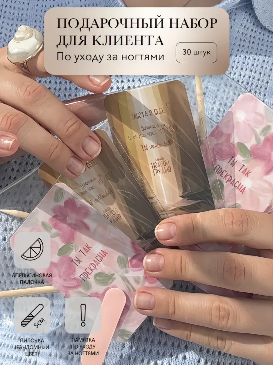 30 подарочных наборов для вашего гостя, куда входит: одноразовая пилочка для ногтей, апельсиновая палочка,а также памятка по уходу за нарощенными ногтями или покрытые гель-лаком со стильным дизайном, формат 8см/5см, на плотном картоне, с отличным качеством печати. Памятка поможет соблюдать правила ухода за ногтями, увеличить носибельность, качество и эффективность после процедуры. Такой набор поможет проявить гостям, заботу, сервис, покажет хорошую клиентоориентированность. Его захочется выложить в сторис, в социальные сети с вашей отметкой. Текст мотивация - аффирмация на памятке по уходу за ногтями привлечет внимание стильных девушек и новых клиентов, ценящих эстетику, минимализм, гедонизм, которые осознанно подходят к жизни. Памятку можно использовать в качестве закладки в книгу или мотивационную открытку.