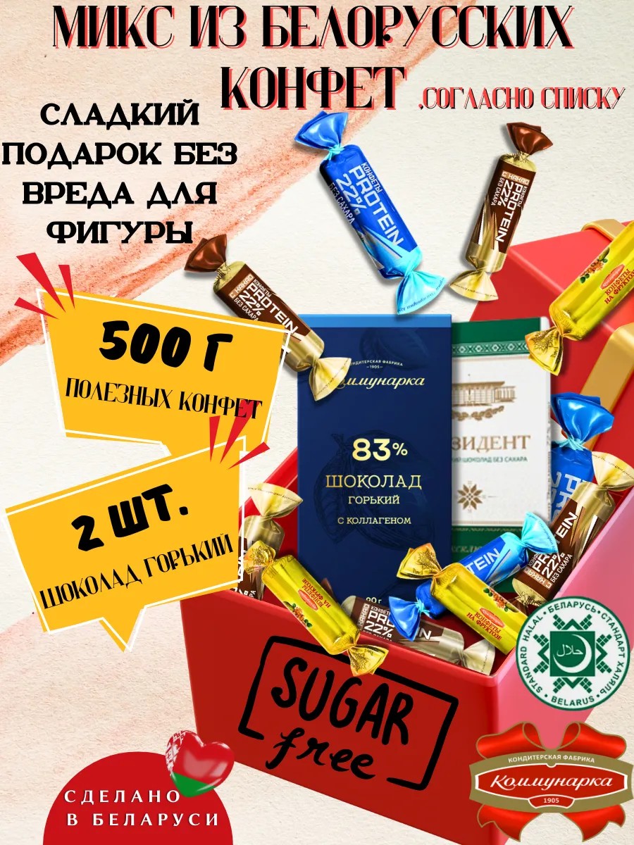 By purchasing a box of PP candies, you will get the great pleasure of enjoying a mix of protein candies without SUGAR, plus you will try the new products of the Belarusian chocolate shop Without SUGAR "Collagen" and "President" - these two most delicious chocolates will transport you to the world of childhood.