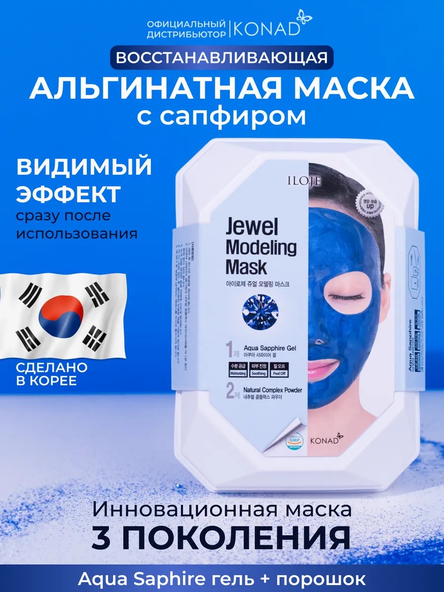 Альгинатная маска для лица от Konad Iloje Jewel Modeling Mask Aqua Saphire – это эффективное средство для роскошного ухода за кожей, предназначенное для борьбы с морщинами, тусклым цветом кожи, лифтинга и увлажнения. Инновационная драгоценная маска 3го поколения одним из главных преимуществ яляется отсутствие необходимости разбавлять масочку водой. В комплекте идет гель с настоящей сапфировой пудрой (3ppm), который смешавшись с порошком превращает его в готовое к использованию средство. Состав маски для лица включает в себя натуральные растительные и эффективные компоненты: гиалуроновая кислота, коллаген, ниацинамид, пептиды, масло ши, экстракты солодки, камелии китайской, имбиря, лимонника, коптиса японского. Этот уникальный гипоаллергенный состав делает альгинатную маску подходящей для всех типов кожи, включая сухую и чувствительную. Применение альгинатной маски профессиональной способствует глубокому увлажнению, улучшению цвета кожи и уменьшению видимости мелких морщин. Благодаря альгинату легко наносится и легко снимается без остатка, оставляя кожу мягкой увлажненной и роскошно сияющей.