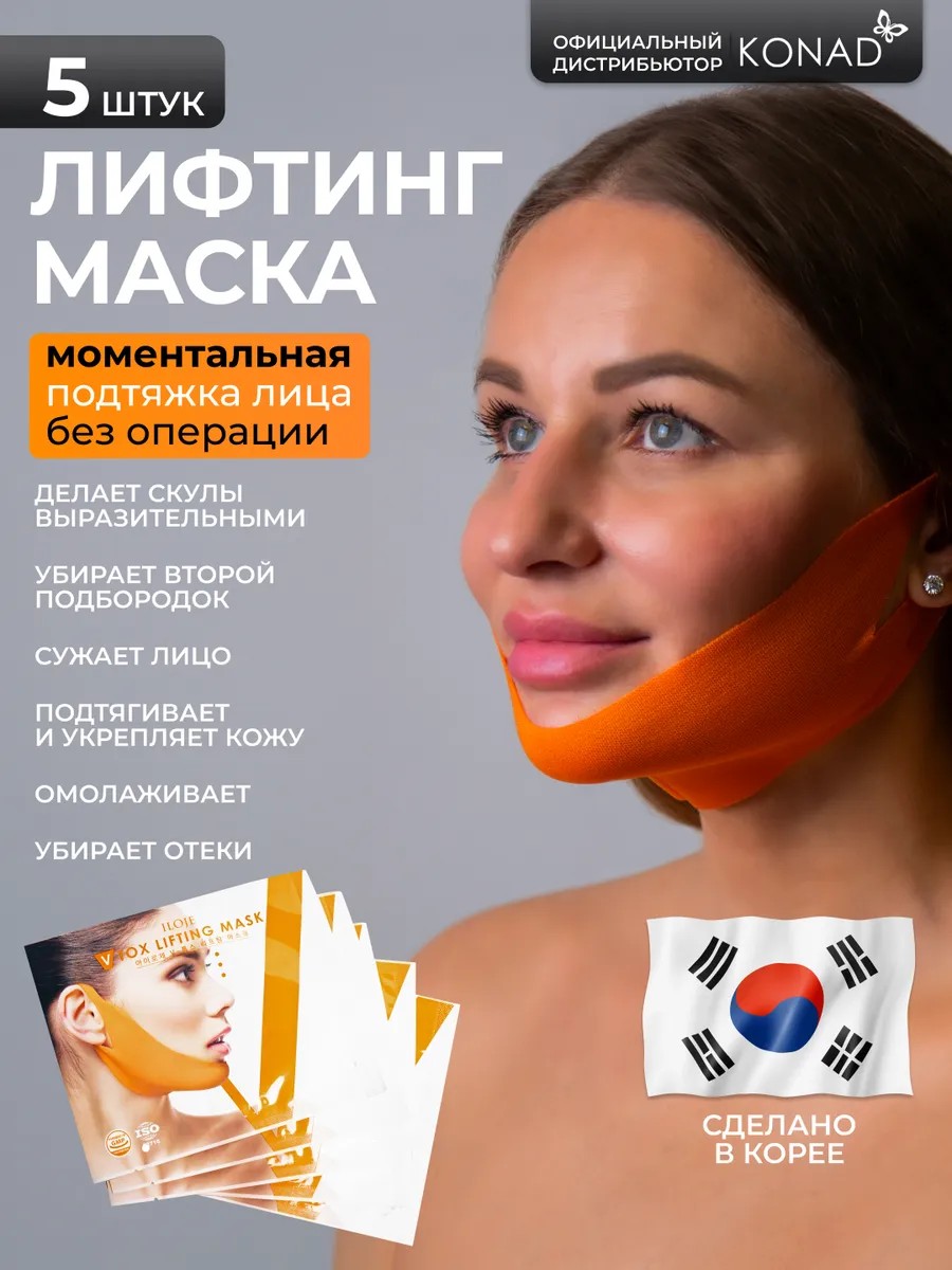 ILOJE V-Tox Lifting Korea mask 5шт. Корейская тканевая маска лифтинг-эффект ( на подобии медицинского бандажа ) для придания и повышения упругости и тонуса так называемого " треугольника молодости ". Вы давно ищите способ убрать второй подбородок и подтянуть овал не посещая хирурга? без операционная подтяжка овала лица. У бренда KONAD есть лучшее решение. Ведь кто как не азиатские девушки знают все секреты красоты и поддерживают только со своей, усовершенствованным средством нового времени.