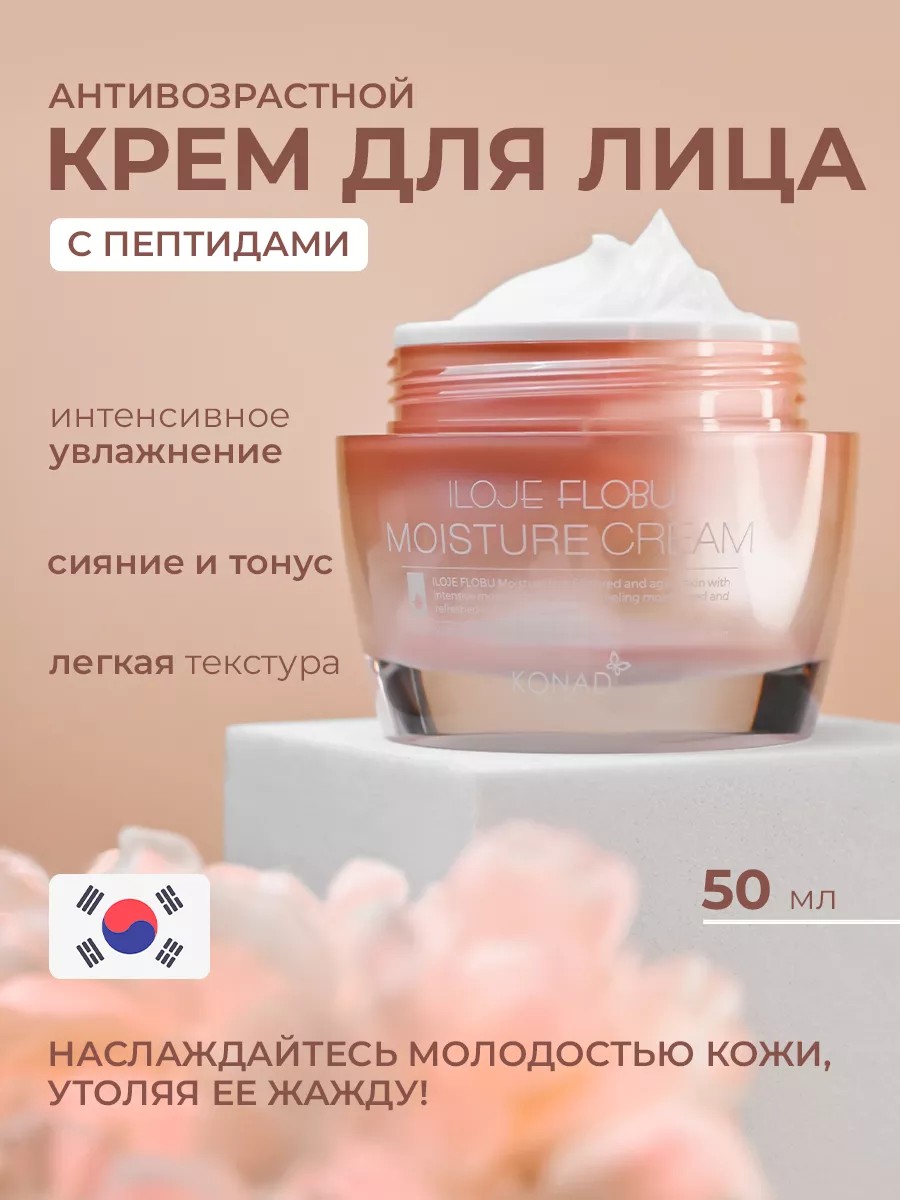 We present to you the moisturizing face cream Konad iloje Flobu Moisture Cream 50g., which contains peptides and hyaluronic acid, extracts of olive, aloe, mallow root, jasmine, shea butter, sunflower seed oil and deep ocean water.