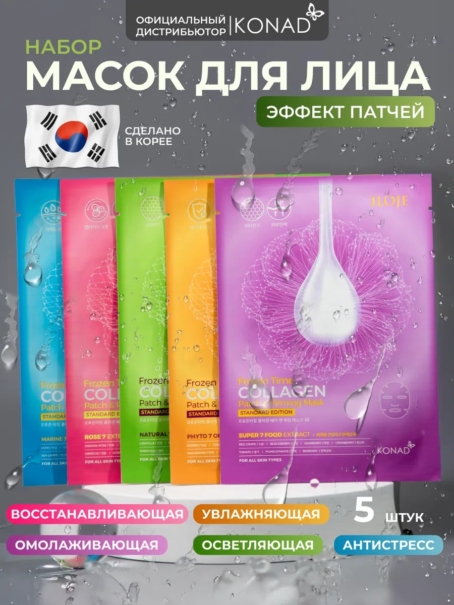 Набор тканевых корейских косметических одноразовых масок для лица с эффектом патчей 5 шт.