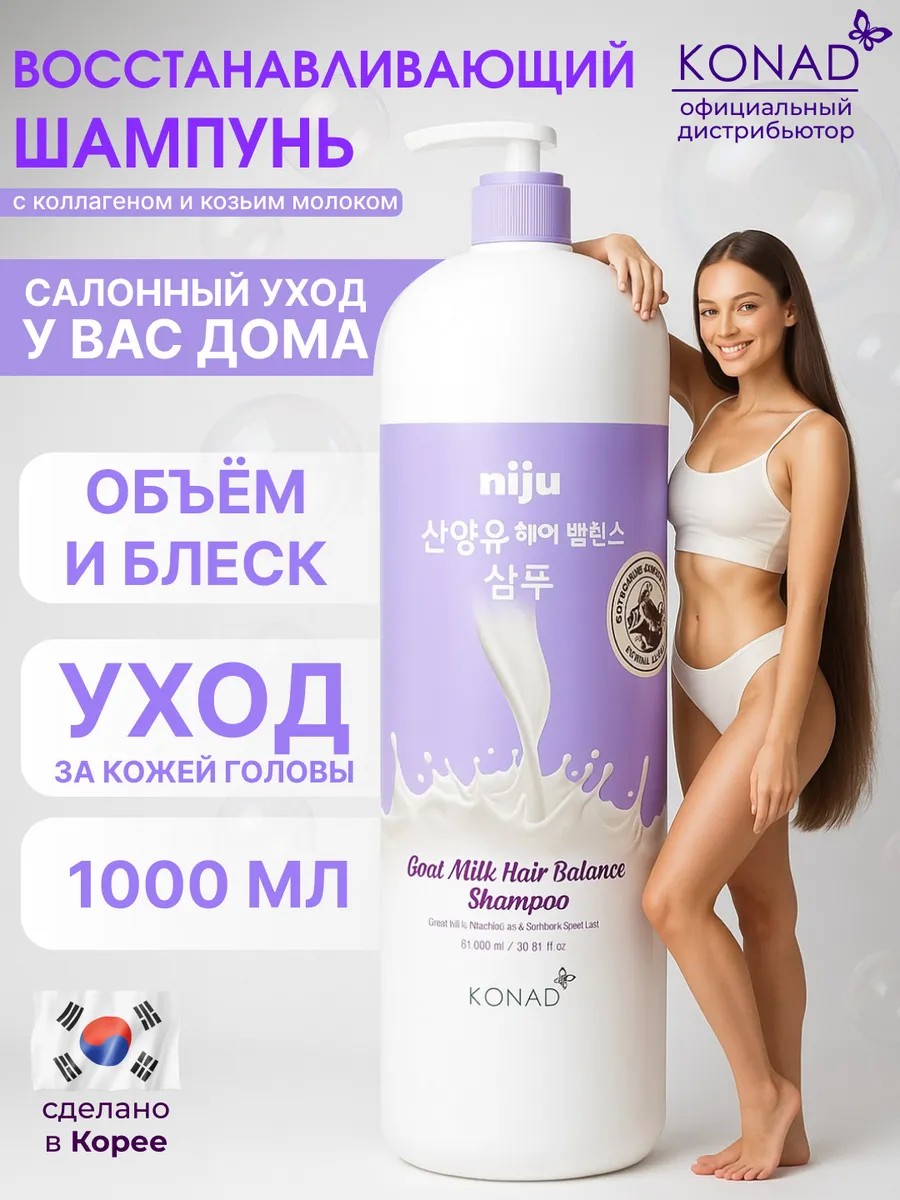 Konad Niju Goat Milk Hair Balance Shampoo. Balancing shampoo for women and men (1000 ml) with goat milk. It contains nutrients similar to breast milk. It is rich in albumin globulin and selenium, which help maintain healthy skin. Selenium prevents dandruff. Hydrolyzed collagen adds volume, shine, and elasticity. This hair care product is suitable for adults and the elderly, teenagers, and children. It gives hair a healthy look without weighing it down. Women's hair shampoo is essential care cosmetics. It also contains vitamins that protect and restore damaged strands. Your hair looks lifeless after coloring or natural changes such as heat, salt water, and wind. Split ends and shiny hair quickly become dirty and greasy. Men's shampoo will help make your hair shiny, voluminous, and manageable. A conditioner from the same brand, Konad Korean Cosmetics, completes the treatment. This 1000 ml conditioner lasts a long time, replacing salon treatments and addressing concerns for every family member: wives, mothers, grandmothers, husbands, women and men, children, teenagers, and babies. It gently cleanses hair and scalp without irritating or itching sensitive scalps, and is effective as an anti-dandruff and anti-hair loss shampoo. This cleansing, safe shampoo is suitable for color-treated, normal, curly, frizzy, long, porous, weakened, and unruly blonde and brunette hair. This basic, rinse-off beauty treatment with a laminating effect restores curls after straightening and perming. It provides easy combing, intensive strengthening, thickening, smoothing, and frizz control, leaving hair smooth and full of body, along with complete nourishment. This smoothing Korean shampoo makes hair beautiful, strong, and thick, creating root volume. A great gift for a friend! A gift for mom, and simply the perfect gift.