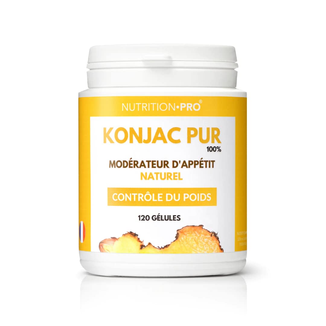 : A NATURALLY EFFECTIVE APPETITE SUPPRESSANT. Konjac, also known as glucomannan, is a plant that grows in certain regions of Asia. Also used in Traditional Chinese Medicine, konjac is widely consumed as a 100 natural dietary supplement for appetite reduction and weight loss. By taking our konjac-based dietary supplement, you will feel full throughout the day thanks to its glucomannan content, which gives it a very powerful satiating effect. You will therefore be much less likely to overeat or snack between meals. DIRECTIONS FOR USE: Take 1 Pure Konjac capsule (15 minutes to 1 hour) before each meal of the day with a large glass of water. PRECAUTIONS: Keep out of reach of children. Consume as a supplement to a varied and balanced diet. Do not exceed the recommended dose. Contains caffeine not recommended for children or pregnant women. Ingredients 100 Konjac Amorphophallus konjac (rhizome) Vegetable capsule: HPMC.REDUCES SNACKING CRAVINGS: By feeling full throughout the day, you'll be less inclined to overeat or snack between meals. REGULATES INTESTINAL TRANSIT: Its high fiber content helps regulate bowel movements. Its richness in prebiotics provides a real health benefit for the gut microbiota. CONTRIBUTES TO WEIGHT LOSS: Konjac is an excellent option for initiating and maintaining weight loss by limiting cravings and snacking urges. Furthermore, once ingested, konjac absorbs fats and sugars. EFFECTIVELY REDUCES APPETITE: Konjac's high fiber content provides a genuine feeling of satiety.Description du produit UN COUPE-FAIM NATURELLEMENT EFFICACE Le konjac, également connu sous le nom de glucomannane, est une plante qui pousse dans certaines régions d'Asie. Également utilisé dans la médecine traditionnelle chinoise, le konjac est grandement consommé comme complément alimentaire 100 naturel pour la réduction d'appétit et la perte de poids. En prenant notre complément alimentaire à base de konjac, vous vous sentirez rassasié tout au long de la journée grâce à sa teneur en glucomannanes qui lui donne un pouvoir rassasiant très puissant. Vous serez donc beaucoup moins susceptible de manger en trop grande quantité ou de grignoter entre les repas. CONSEILS D'UTILISATION Prendre 1 gélule de Konjac Pur (15 minutes à 1 heure) avant chaque repas de la journée avec un grand verre d'eau. PRÉCAUTIONS D'EMPLOI Tenir hors de portée des enfants. À consommer en complément d'une alimentation variée et équilibrée. Ne pas dépasser la dose conseillée. Contient de la caféine, déconseillé aux enfants et aux femmes enceintes. Ingrédients 100 Konjac Amorphophallus konjac (rhizome) Enveloppe végétale: HPMC.RÉDUIT LES ENVIES DE GRIGNOTAGE : En vous sentant rassasié tout au long de la journée, vous serez moins enclin à manger en excès ou à grignoter entre les repas. RÉGULE LE TRANSIT INTESTINAL : Sa haute teneur en fibres permet de régulariser le transit. Sa richesse en prébiotiques lui confère un réel atout santé pour le microbiote. CONTRIBUE À LA PERTE DE POIDS : Le konjac est une excellente option pour instaurer et contenir une perte de poids en limitant les fringales et les envies de grignoter. De plus, une fois ingéré, le konjac absorbe les graisses et le sucre. RÉDUIT EFFICACEMENT L'APPÉTIT : La forte teneur en fibres du konjac procure une réelle sensation de satiété.Konjac Pur 100 - 120 gélules Coupe faim naturel Minceur Fabriqué en France Nutrition pro
