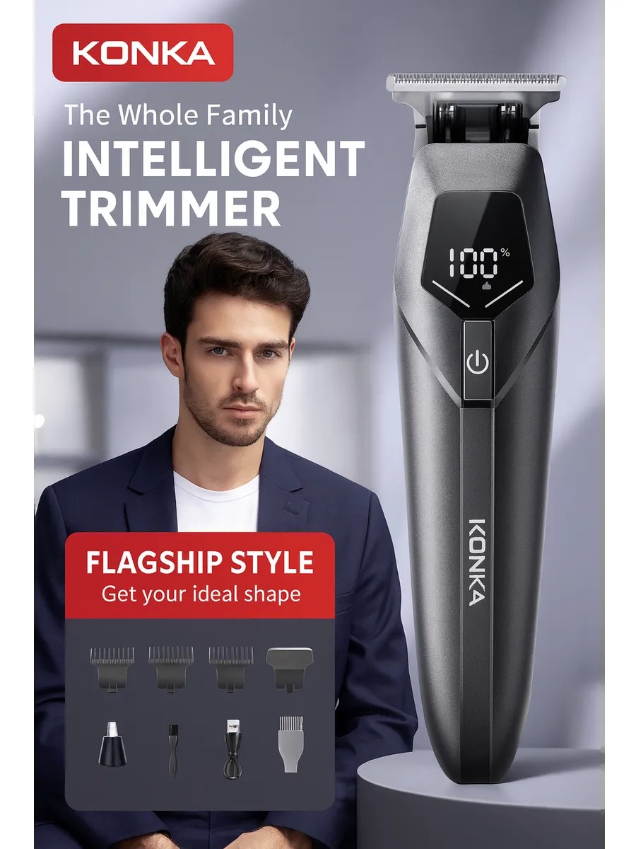 A powerful and quiet KONKA electric shaver with a high-speed motor and battery indicator. The ultra-short blade spacing (0.1 mm) ensures a close shave and precise styling. Includes 3 comb attachments, oil, a brush, and a Type-C cable. Ideal for trimming, shaving, and styling at home.
