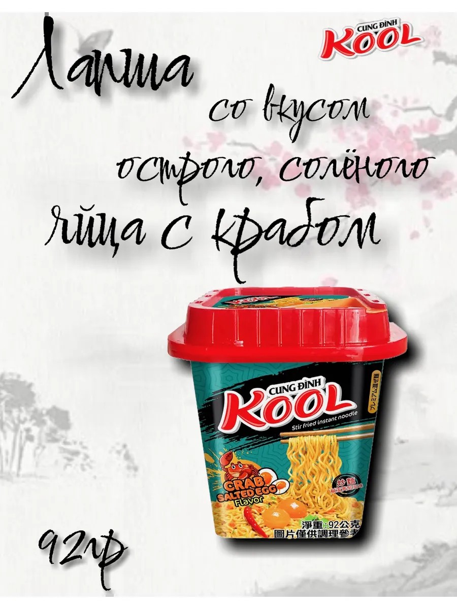 Kool Instant Noodles with a Spicy Salted Egg Flavor are a great option for a quick and delicious snack. These Korean-style wheat noodles will delight you with their rich flavor and aroma. The spicy and salty notes, complemented by the crab flavor, will make your lunch or dinner unforgettable. The convenient 92-gram package is ideal for one person.