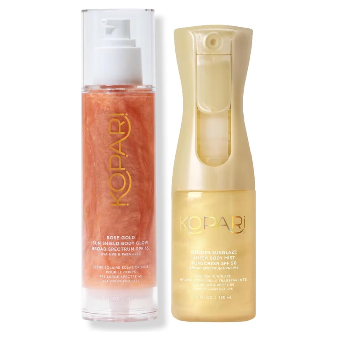 Kopari Sun Shield Body Glow Broad Spectrum SPF 45 in Rose Gold & Golden Sunglaze Sheer Body Mist Sunscreen SPF 50