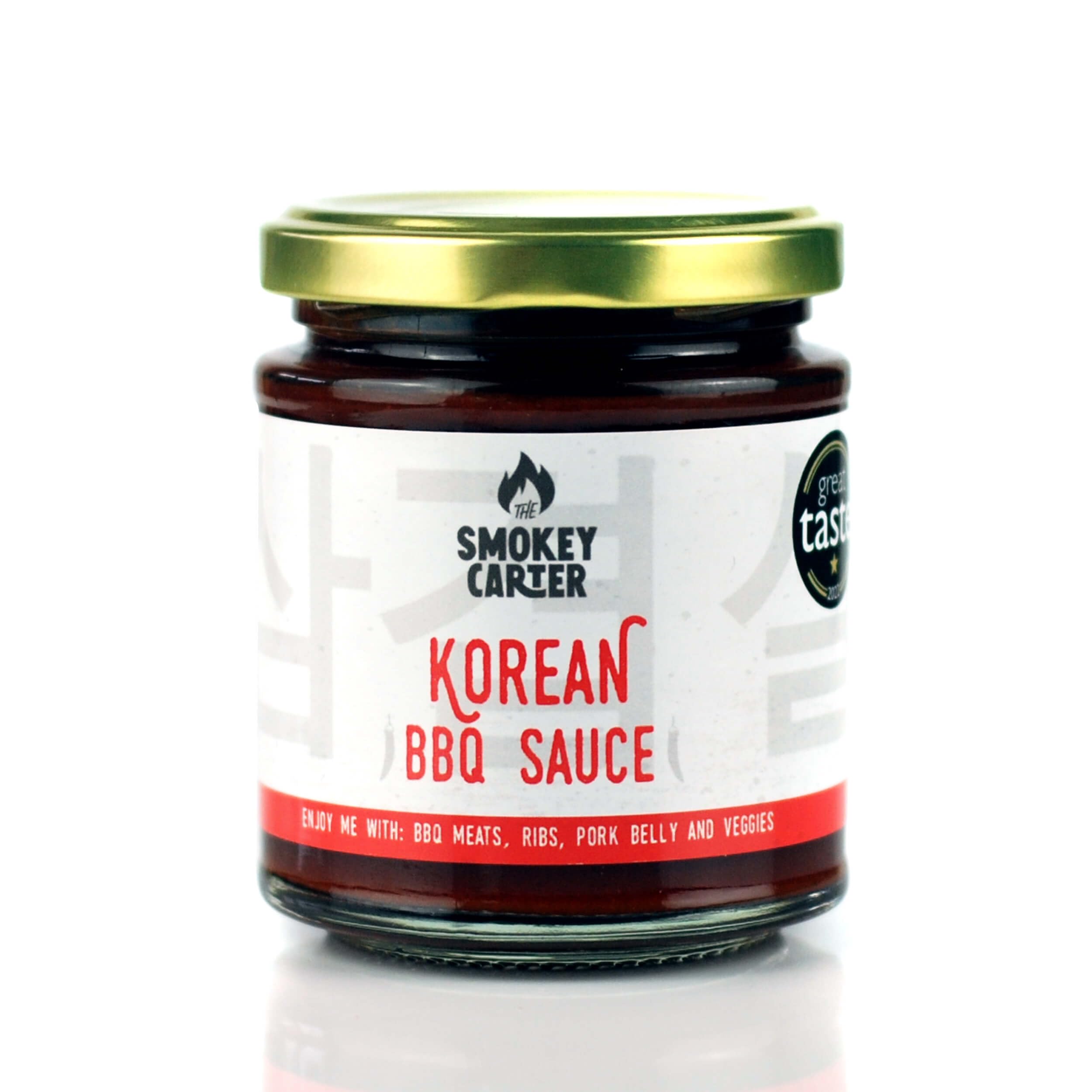 Korean Barbecue Sauce. Contains SESAME, WHEAT & SOY Enjoy me with: BBQ meats, ribs, pork belly and veggies. Umami-rich condiment/ marinade with gochujang, sesame, soy, miso and roasted garlic. Dip, dollop, baste and brush. This Korean BBQ Sauce is packed with flavour and umami notes. Including those classic Korean ingredients, such as gochujang (fermented soyabean hot red pepper paste), sesame oil and low sodium soy sauce. To take our sauce to the next level we have also added white miso, lots of roasted garlic and a few secret spices. Ingredients: Tomato, muscovado sugar, Gochujang chilli paste (corn syrup, red pepper, rice, water, soybean, glutinous rice, rice flour, koji), soy sauce (water, soybeans, wheat, salt), sugar, toasted sesame oil, roasted garlic, onion, white miso (water, soybeans, rice, salt, yeast, koji culture), distilled vinegar, ginger, spices. Nutrition: Typical values per 100g; Energy 689kJ/163Kcal, Fat 3.1g (of which saturates 0.5g), Carbohydrate 32g (of which sugars 29g), Fibre 1g, Protein 1.5g, Salt 1.9g. For allergens, including cereals containing gluten, see ingredients in bold. Manufactured in a facility that handles celery, mustard, soya, sesame and ingredients that may contain nuts.✓ THE SMOKEY CARTER | OVER 10 YEARS IN THE UK BBQ RUB & SAUCE BUSINESS. ✓ Perfect with pork belly, ribs, chicken skewers or in stir frys. Simply enjoy as an accompaniment to any meal. ✓ Enjoy me with: BBQ meats, ribs, pork belly and veggies. Umami-rich condiment/ marinade with gochujang, sesame, soy, miso and roasted garlic. ✓ GOLD STAR WINNER | GREAT TASTE AWARDS 2022. ✓ 1 x 200g JAR - KOREAN BBQ SAUCE.