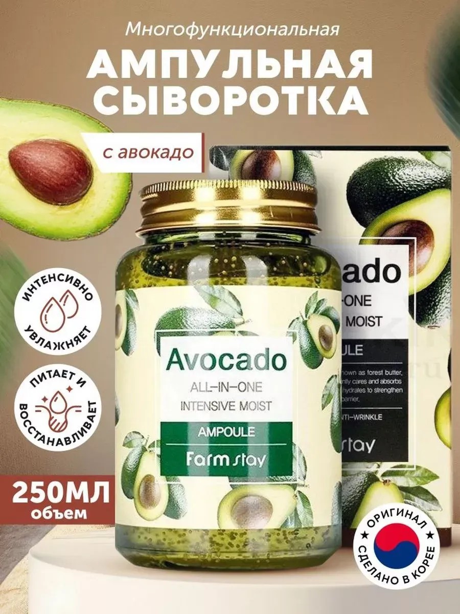 FARM STAY AVOCADO ALL-IN-ONE INTENSIVE MOIST AMPOULE, 250 ml, is a unique Korean cosmetic product featuring a powerful complex of active ingredients that deeply hydrate, nourish, and rejuvenate the skin of the face and body.
