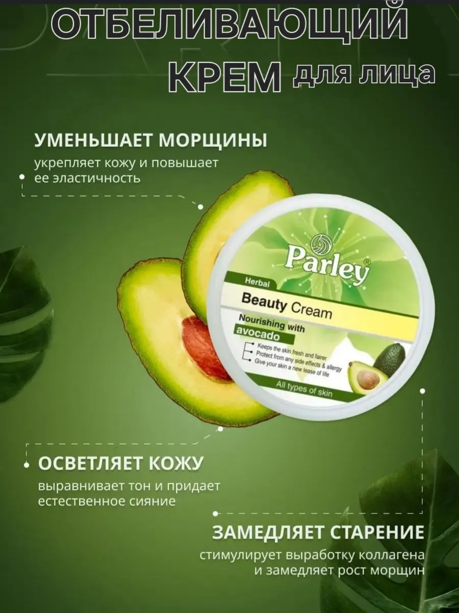 Чудо крем отбеливающий крем для любого типа кожи. Питает и увлажняет. Крем против сухости и шелушения. Придает сияние. Активные компоненты: экстракт масла авокадо, витамин B3, витамины C и D Уменьшает морщины, осветляет кожу, замедляет старение.Отбеливающий крем для тех, кто мечтает о светлом, чистом, ровном тоне кожи лица! Веснушки, пигментные пятна различного происхождения, покраснения, а также тусклость кожи портят не только внешний вид, но и настроение. Beauty Cream от Пакистанского производителя Parley с авокадо является эффективным способом для осветления кожи лица.Растительные экстракты оказывают успокаивающее и противовоспалительное действие уменьшают различные покраснения кожи, проявления купероза устраняют шелушение, раздражение придают коже гладкость мягкость ухоженный вид матовость внутреннее сияние, чистоту, упругость и эластичность, оказывают выраженный лифтинг эффект. Питательный крем с маслами против сухости кожи, оберегает от агрессивных внешних воздействий, предупреждает фотостарение, дарит лицу ровный красивый оттенок. Питательное масло авокадо обладает регенерирующими, успокаивающими и восстанавливающими свойствами. Является крайне эффективным в быстром заживлении ран и трещин. Успокаивает раздражения и восстанавливает кожный покров, придавая ему красивый ухоженный вид. Обогащает витаминами и улучшает кровообращение. Масло авокадо в составе глубоко гидрирует кожу, освежает и тонизирует. Обладает высоким омолаживающим потенциалом. Способствует быстрому заживлению ранок.