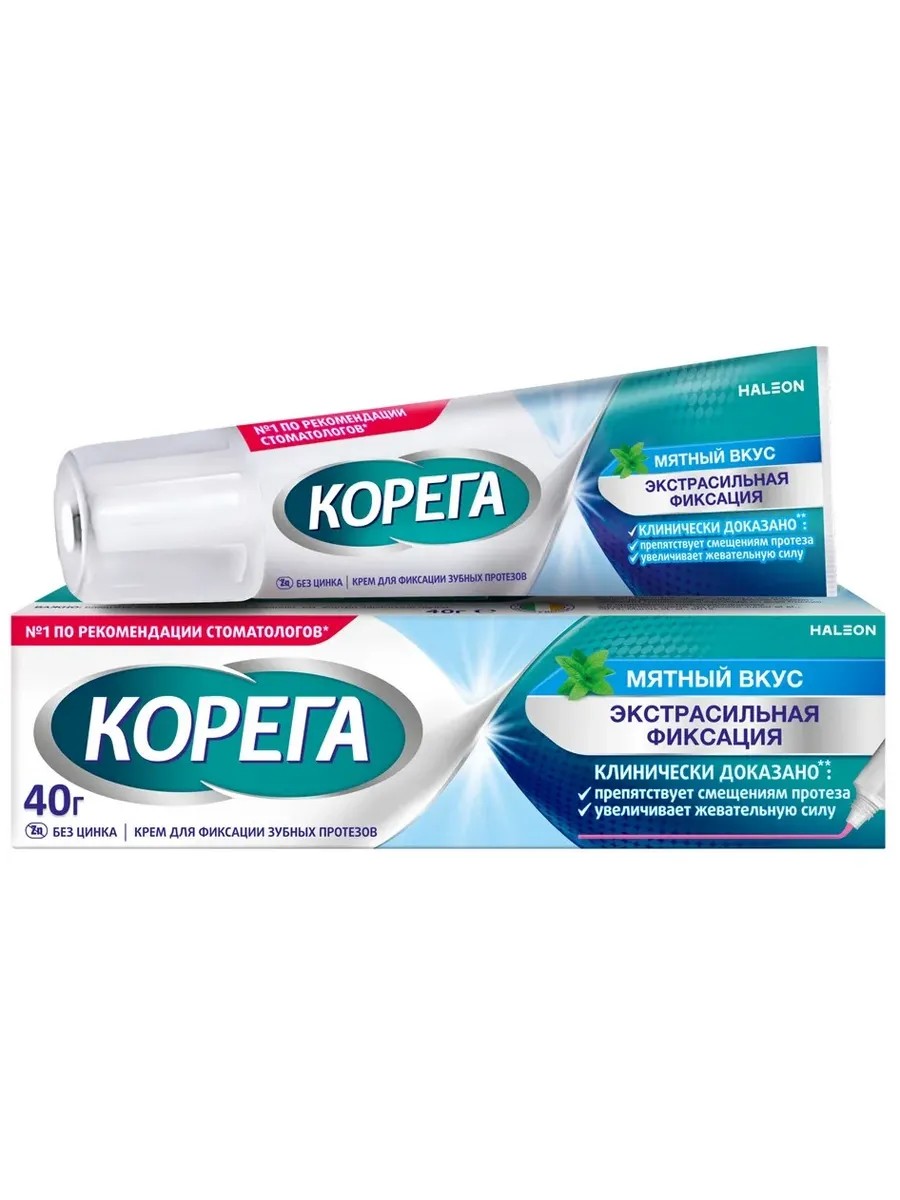 Крем для фиксации зубных протезов Корега Экстра сильный мятный повышает качество жизни людей, использующих зубные протезы: Предотвращает попадение частичек пищи под протез за счет всесторонней фиксации.