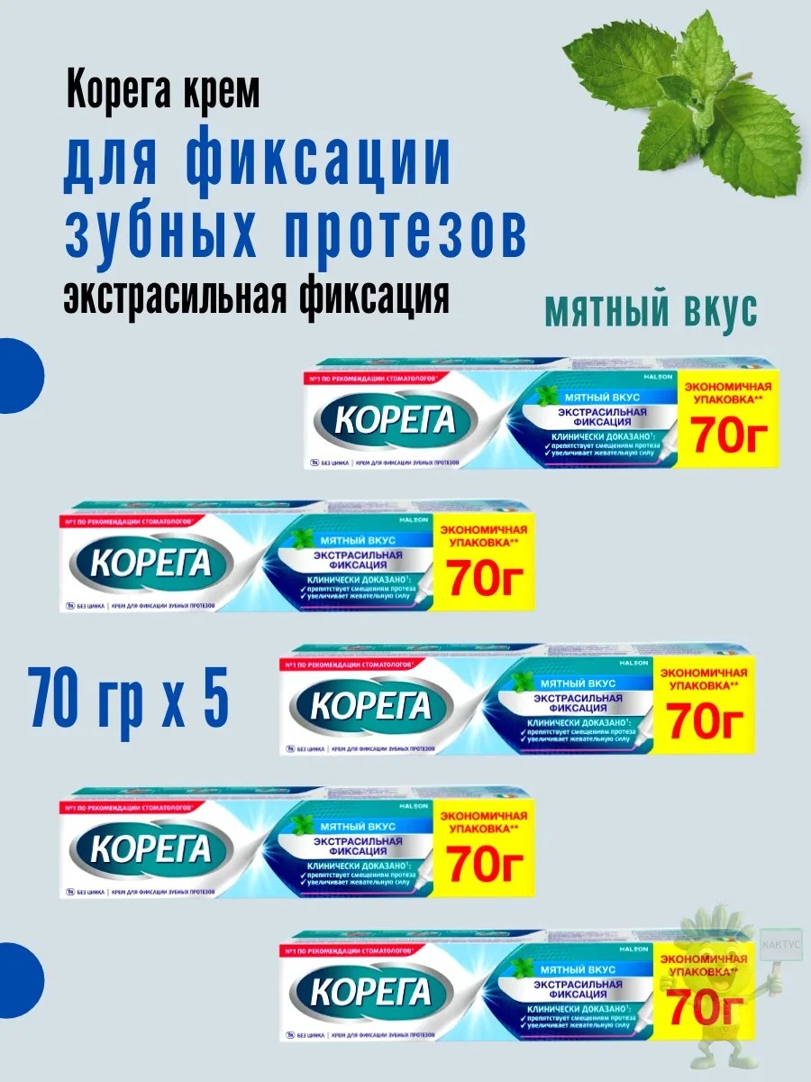 | Комплектация | Корега крем для фиксации зубных протезов мятный вкус 70 гр; комплект из 5-и штук |