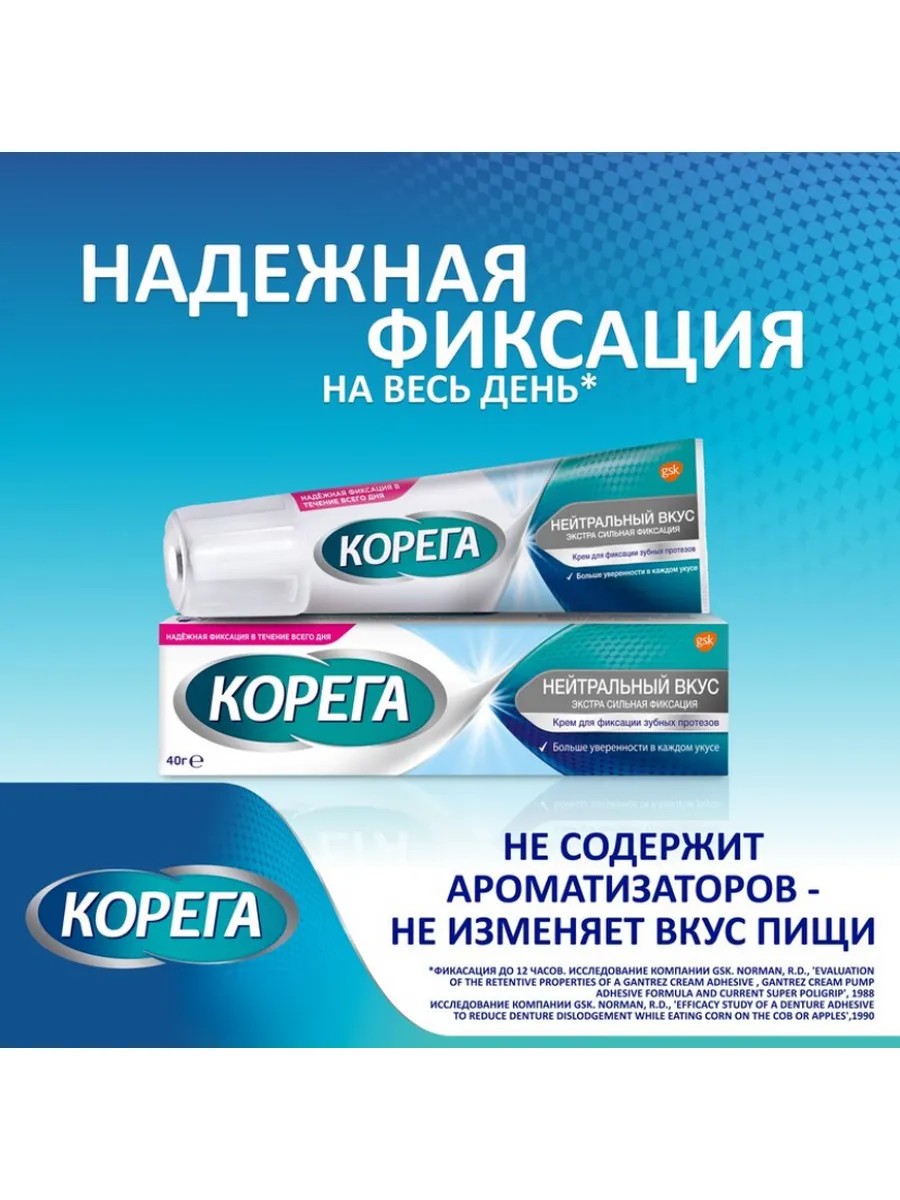 Крем Корега обеспечивает надежную фиксацию в течение всего дня, предотвращает смещение протеза в полости рта и попадание частичек пищи даже под хорошо припасованный протез, позволяя вам говорить, есть и улыбаться уверенно!