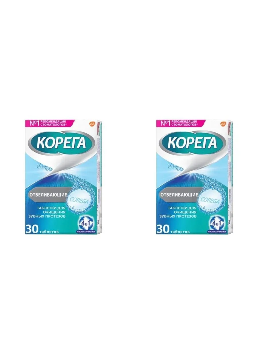 корега дентал вайт д/отбелив з/протезов n30 табл. очищают и отбеливает трудноудаляемые налеты и окрашивания зубных протезов, не разъедая материалы, из которых они изготовлены. применять только вне полости рта * corega корега отбеливающие, таблетки для очищения зубных протезов - средство для ежедневного очищения, которое помогает сохранить первоначальную белизну ваших зубных протезов.зубные протезы приблизительно в 10 раз мягче зубной эмали, поэтому абразивные частицы обычной зубной пасты оставляют царапины, в которых размножаются бактерии.таблетки корега отбеливающие очищают зубные протезы эффективнее обычной зубной пасты. таблетки за 3 минуты на 99,9% уменьшают число бактерий, вызывающих неприятный запах изо рта, и помогают сохранить исходную белизну вашего зубного протеза.основные преимущества:- на 99,9% уменьшают число бактерий, вызывающих неприятный запах изо рта.*- удаляют налет и стойкие пятна.- сохраняют первоначальную белизну ваших зубных протезов.- не царапают зубной протез при очищении.* при замачивании, по результатам лабораторных исследований. оценка антимикробной эффективности средства для чистки зубных протезов. обзор компании гск, 20121. положите таблетку в стакан с теплой (не горячей) водой, чтобы полученный раствор полностью покрывал зубной протез.2. замочите зубной протез на 3 минуты.3. почистите протез мягкой зубной щеткой с использованием раствора.4. тщательно ополосните протез проточной водой.5. раствор, оставшийся после использования, следует немедленно вылить.не использовать раствор для полоскания рта и не принимать внутрь.препарат предназначен только для очистки протезов.