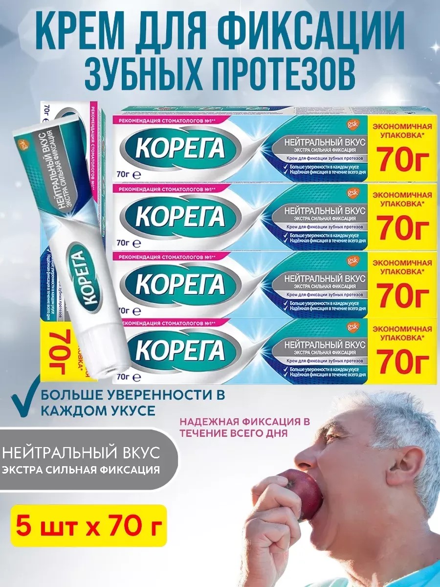 Крем для фиксации зубных протезов Корега Нейтральный Вкус - 5 шт/уп, повышает качество жизни людей, использующих зубные протезы. Основные преимущества:- Предотвращает попадание частичек пищи под протез- Фиксирует протез в течение 12 часов- Не содержит ароматизаторов, не изменяет вкус пищи.
