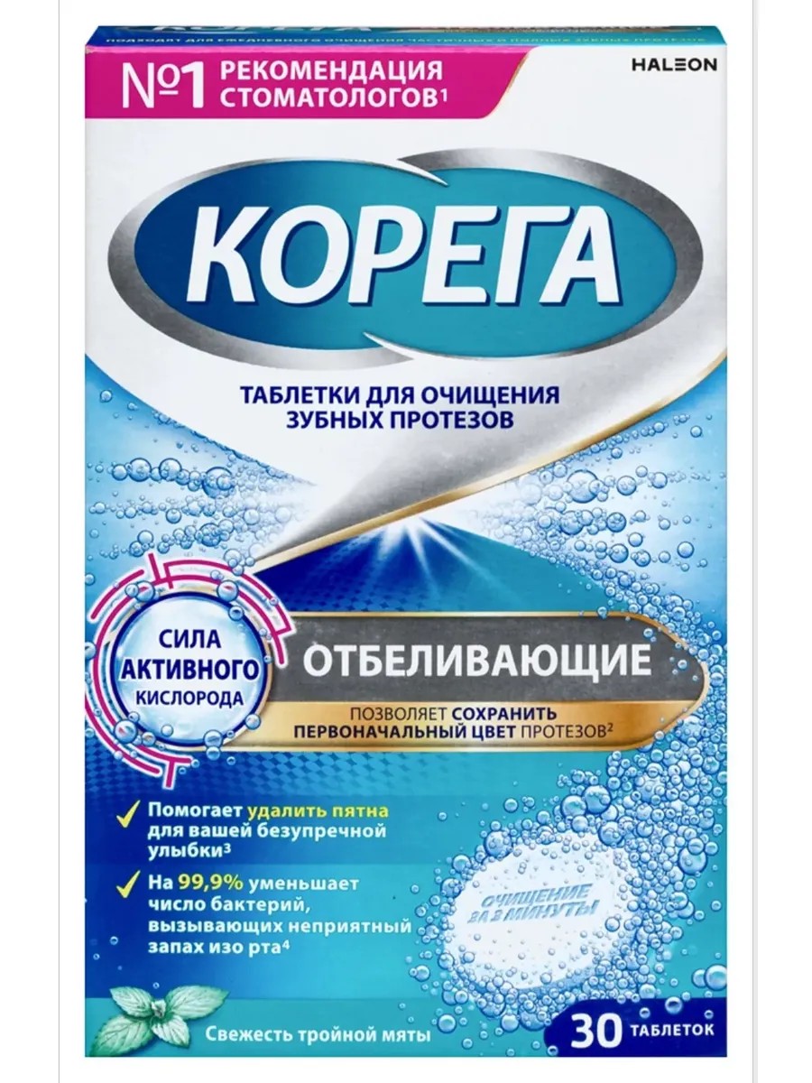 Таблетки Корега подходят тем, кто стремится к глубокому очищению съемных зубных протезов. Таблетки для очищения зубных протезов Корега Отбеливающие обеспечивают бережное и эффективное очищение зубных протезов.