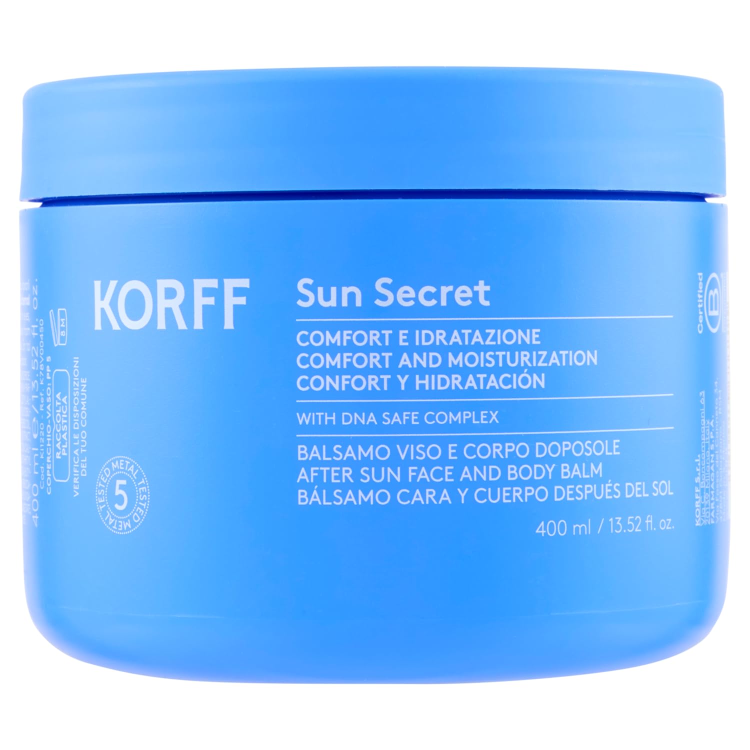 A soft, creamy emulsion with a fresh, fast-absorbing texture. Its innovative formula, with DNA-Safe Complex and plant oils, preserves the skin's beauty and deeply nourishes photo-damaged tissue. INGREDIENTS Aqua (WATER), GLYCERIN, CAPRYLIC CAPRIC TRIGLYCERIDE, DICAPRYLYL CARBONATE, SUCROSE POLYSTEARATE, BUTYROSPERMUM PARKII (SHEA) BUTTER, OLEYL ERUCATE, BIS-STEARYL DIMETHICONE, CETYL ALCOHOL, CYCLOPENTASILOPTASILOPTASILOPATE. XANE, DIMETAL HICONE, HYDROGENATED POLYISOBUTENE, CETEARETH-25, SODIUM POLYACRYLATE, HYDROGENATED RAPESEED OIL, ALLANTOIN, ALOE BARBADENSIS LEAF JUICE, PISUM SATIVUM (PEA) EXTRACT, PHRAGMITES KARKA EXTRACT, PORIA COCOS EXTRACT, ERIE ODICTYON CALIFORNICUM FLOWER LEAF STEM EXTRACT, CYCLODEXTRIN, PENTAERYTHRITYL TETRA-DI-T-BUTYL HYDROXYHYDROCINNAMATE, TETRASODIUM EDTA, BUTYLENE GLYCOL, PHENOXYETHANOL, ETHYLHEXYLGLYCERIN, SODIUM BUSIUM BUSIUM BUSIUM ENZOATE, TEE TRAMETHYL ACETYLOCTAHYDRONAPHTHALENES, HEXAMETHYLINDANOPYRAN, Linalyl acetate, acetyl cedrene, dimethyl phenethyl acetate, pogostemon cablin oil, isoeugenyl acetate, parfum (fragrance). Safety warning: For external use only. Avoid contact with eyes if you wash them with water, do not contact the eyes. Keep closed and away from heat. See moreFor external use only. Suitable for all leather types. Formulated with DNA-Safe Complex and plant oils, it preserves the skin's beauty and deeply nourishes sun-damaged tissue. Fresh, fast-absorbing texture soft and creamy emulsion. SUN SECRET Soothing Moisturizing After-Sun Lotion.Korff Sun Secret Après-soleil Hydratant Apaisant 400 mlDESCRIPTION DU PRODUIT DESCRIPTION DU PRODUIT Émulsion douce et crémeuse à la texture fraîche et d'absorption rapide. Sa formulation innovante, avec DNA-Safe Complex et huiles végétales, préserve la beauté de la peau et nourrit en profondeur les tissus photo endommagés. INGRÉDIENTS Aqua (WATER), GLYCERIN, CAPRYLIC CAPRIC TRIGLYCERIDE, DICAPRYLYL CARBONATE, SUCROSE POLYSTEARATE, BUTYROSPERMUM PARKII (SHEA) BUTTER, OLEYL ERUCATE, BIS-STEARYL DIMETHICONE, CÉTYL ALCOHOL, CYCLOPENTASILOPTASILOPTASILOPATE. XANE, DIMETAL HICONE, HYDROGENATED POLYISOBUTENE, CETEARETH-25, SODIUM POLYACRYLATE, HYDROGENATED RAPESEED OIL, ALLANTOIN, ALOE BARBADENSIS LEAF JUICE, PISUM SATIVUM (PEA) EXTRACT, PHRAGMITES KARKA EXTRACT, PORIA COCOS EXTRACT, ERIE ODICTYON CALIFORNICUM FLOWER LEAF STEM EXTRACT, CYCLODEXTRIN, PENTAERYTHRITYL TETRA-DI-T-BUTYL HYDROXYHYDROCINNAMATE, TETRASODIUM EDTA, BUTYLENE GLYCOL, PHENOXYETHANOL, ETHYLHEXYLGLYCERIN, SODIUM BUSIUM BUSIUM BUSIUM ENZOATE, TEE TRAMETHYL ACETYLOCTAHYDRONAPHTHALENES, HEXAMETHYLINDANOPYRAN, LINALYL ACÉTATE, ACETYL CEDRENE, DIMETHYL PHENETHYL ACÉTATE, POGOSTEMON CABLIN OIL, ISOEUGENYL ACÉTATE, PARFUM (FRAGRANCE). AVERTISSEMENT DE SÉCURITÉ Usage extérieur. Évitez tout contact avec les yeux si vous les lavez avec de l'eau. Conserver fermé et à l'abri de la chaleur. Voir plusMode d'utilisation uniquement pour un usage extérieur. Cuir, convient à tous les types. Formule avec DNA-Safe Complex et huiles végétales, préserve la beauté de la peau et nourrit en profondeur les tissus photos endommagés. Texture fraîche et d'absorption rapide, émulsion douce et crémeuse. SUN SECRET Après-Soleil Hydratant Apaisant.