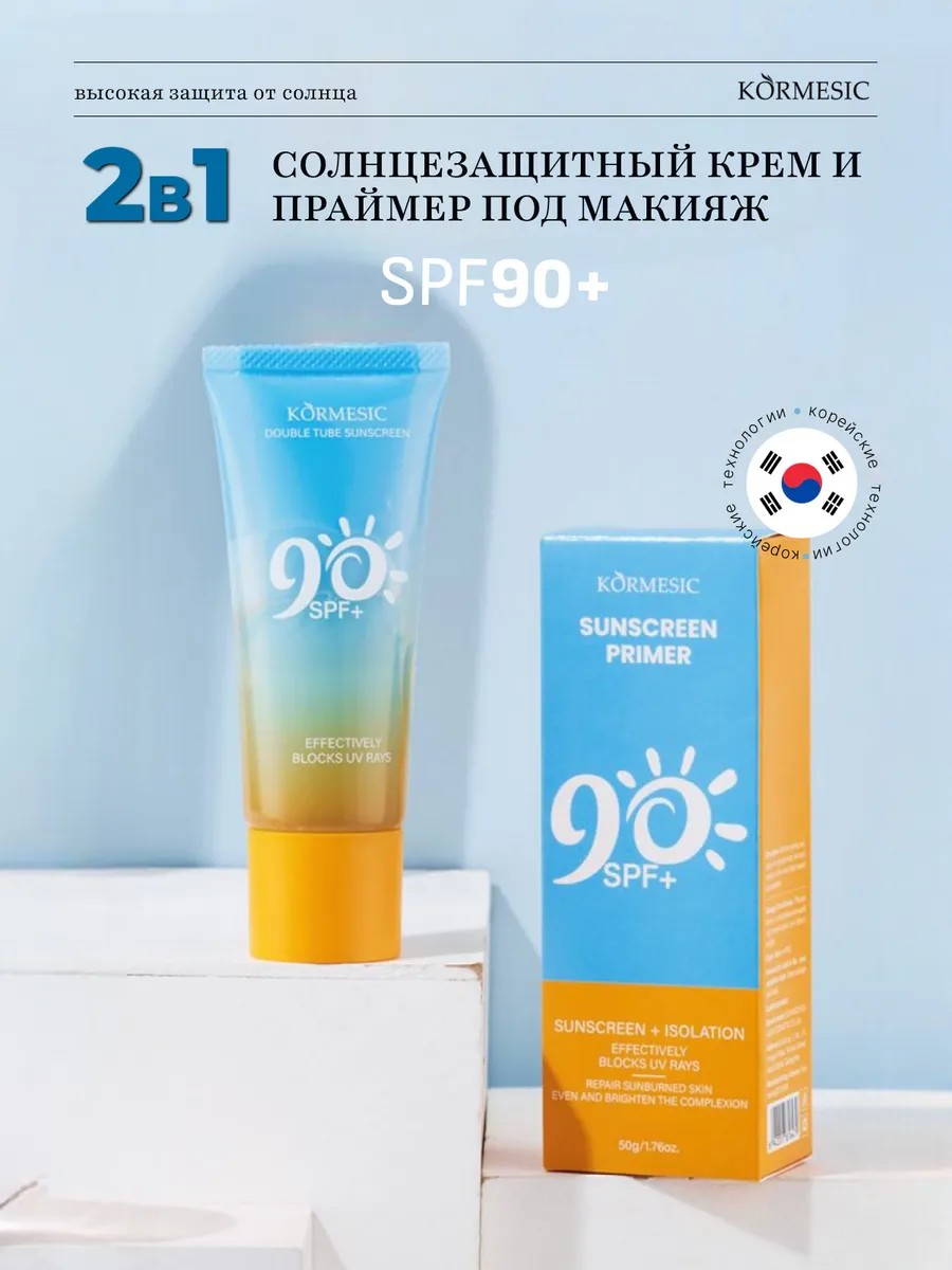 KORMESIC Sunscreen Primer SPF 90+ — это инновационное средство 2-в-1: мощная защита от солнца и праймер под макияж. Формула с высоким SPF 90+ эффективно блокирует вредные UVA и UVB лучи, предотвращая фотостарение, пигментацию и сухость кожи.
