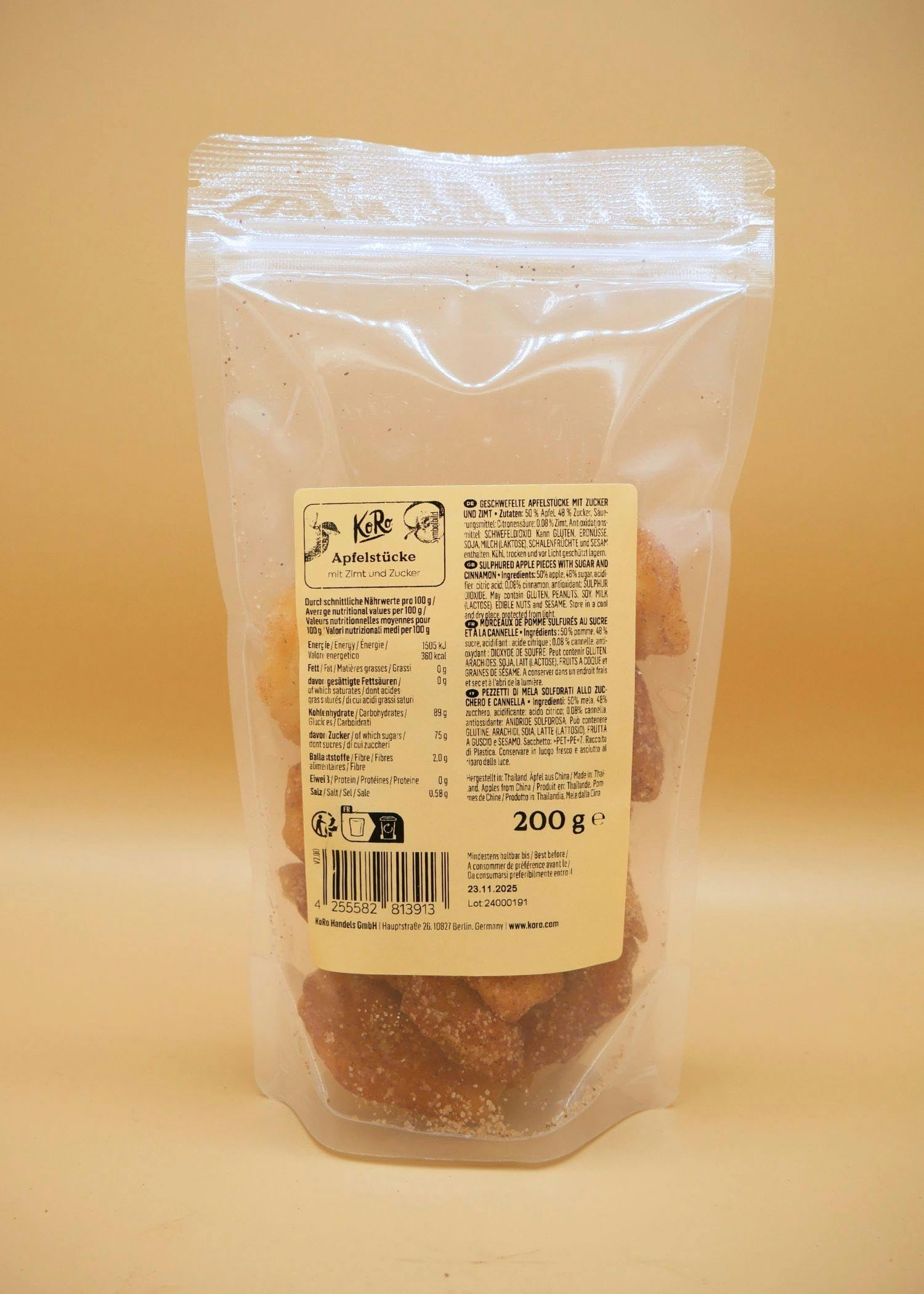 Die Apfelstücke mit Zimt und Zucker von KoRo sind un idealer Snack für zwischendurch. Die Konsistenz der Stücke erinnert an Weingummis, ummantelt mit Zucker und Zimt. Die getrockneten Früchte sind nicht nur ideal für die Weihnachtszeit, wenn die Familie zusammenkommt, sondern auch im Urlaub, als Reisesnack, als Geschenk or als süß-zimtiges Topping für Individual Desserts einsetzbar. Die leckeren Apfelstücke mit Zimt und Zucker sorgen für ganzjährige weihnachtliche Freude. If you don't want to miss the long-term music you'll get from the Extra Class. Damit die fruchtige Leckerei auch immer auf Lager ist, hat KoRo direkt 200 g des Apfel-Zimt-Snacks im To Go-Format parat. Da freut sich der Gaumen! nSo old, so gut – free nach diesem Motto bietet KoRo Lieblingslebensmittel in Grosspackungen an. Das part nicht nur Verpackungsmaterial und Kosten, sondern man hat auch länger was von innovativen Snacks, Superfoods und altbewährten Koch- und Backzutaten. This is why Berliner Unternehmen stetig, seine Produktpalette zu erweitern und dabei so nah wie möglich am Ursprung einzukaufen. INGREDIENTS 50 apple, 48 sugar, acidifier: citric acid cinnamon, antioxidant: SULFUR DIOXIDE. - May contain GLUTEN, PEANUTS, SOY, MILK (LACTOSE), NUTS and SESAME. DIRECTIONS FOR USE Store in a cool, dry place away from light. SAFETY WARNING May contain GLUTEN, PEANUTS, SOY, MILK (LACTOSE), NUTS and SESAME. PRINZIPIAN: Mehr ist einfach mehr! Now you can check the contents of the box in the package – Fully loaded and loaded!. FÜR DICH: Die Apfelstücke mit Zimt und Zucker eigenen sich für die vegane und vegetarian Ernährungsweise. WÜRZIG: Unsere getrockneten Apfelstücke sind schmackhaft gewürzt mit etwas Zimt - schmecken aber nicht nur zur Weihnachtszeit. VIELSEITIG: Der Apfel-Snack enignet sich als optimal Süßigkeit für jeden kuscheligen Filmabend, unterwegs oder im Büro. Ideally when small children are attacked, they are overpowered!. SCHMACKHAFT: Unsere saftigen Apfelstücke mit Zimt und Zucker sind eine leckere Knabberei für Zwischendurch. If there is an alternative to chips and chips you can trust them. Die Apfelstücke mit Zimt und Zucker von KoRo sind ein idealer Snack für zwischendurch. Die Konsistenz der Stücke erinnert an Weingummis, ummantelt mit Zucker und Zimt. Die getrockneten Früchte sind nicht nur ideal für die Weihnachtszeit, wenn die Familie zusammenkommt, sondern auch im Urlaub, als Reisesnack, als Geschenk oder als süß-zimtiges Topping für Desserts individuell einsetzbar. Die leckeren Apfelstücke mit Zimt und Zucker sorgen für ganzjährige weihnachtliche Freude. Sie verwandeln jedes noch so langweilige Müsli zu einem Frühstück der Extraklasse. Damit die fruchtige Leckerei auch immer auf Lager ist, hat KoRo direkt 200 g des Apfel-Zimt-Snacks im To Go-Format parat. Da freut sich der Gaumen! nSo viel, so gut – frei nach diesem Motto bietet KoRo Lieblingslebensmittel in Großpackungen an. Das spart nicht nur Verpackungsmaterial und Kosten, sondern man hat auch länger was von innovativen Snacks, Superfoods und altbewährten Koch- und Backzutaten. Dabei versucht das Berliner Unternehmen stetig, seine Produktpalette zu erweitern und dabei so nah wie möglich am Ursprung einzukaufen. INGRÉDIENTS 50 pomme, 48 sucre, acidifiant : acide citrique cannelle, antioxydant : DIOXYDE DE SULFURE. - Peut contenir du GLUTEN, ARACHIDES, SOJA, LAIT (LACTOSE), FRUITS A COQUE et SÉSAME. MODE D'EMPLOI A conserver au frais et au sec à l'abri de la lumière AVERTISSEMENT DE SÛRETÉ Peut contenir du GLUTEN, ARACHIDES, SOJA, LAIT (LACTOSE), FRUITS A COQUE et SÉSAME. PRINZIPIEN: Mehr ist einfach mehr! Daher gibt es alle Leckereien bei KoRo in Vorteilspackungen – Füllt den Vorratsschrank und erfreut den Geldbeutel!. FÜR DICH: Die Apfelstücke mit Zimt und Zucker eigenen sich für die vegane und vegetarische Ernährungsweise. WÜRZIG: Unsere getrockneten Apfelstücke sind schmackhaft gewürzt mit etwas Zimt - schmecken aber nicht nur zur Weihnachtszeit. VIELSEITIG: Der Apfel-Snack eignet sich als optimale Süßigkeit für jeden kuscheligen Filmabend, unterwegs oder im Büro. Ideal als um den kleinen Heißhungerattacken zu überbrücken!. SCHMACKHAFT: Unsere saftigen Apfelstücke mit Zimt und Zucker sind eine leckere Knabberei für Zwischendurch. Sie sind die süße Alternative zu Chips und bei jedermann beliebt.