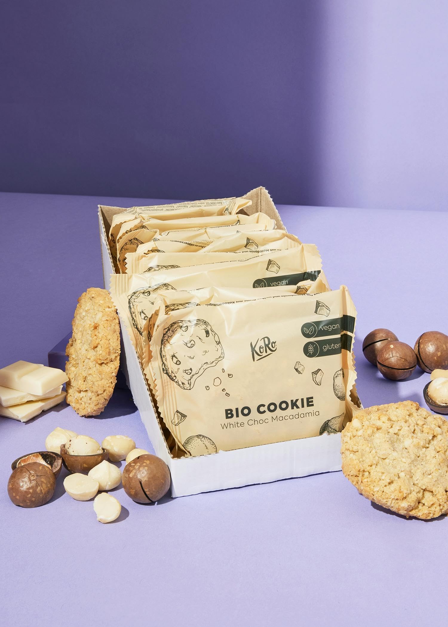 PRINCIPLES: At KoRo, we've made it our mission to provide you with the best quality at fair prices in convenient bulk packaging. That's why we have your favorites in value packs!. VEGAN GLUTEN-FREE: Our organic macadamia cookie contains no animal ingredients and is also gluten-free. You'll enjoy the vegan oat-based cookie pleasure with macadamia nuts, cashews, and vegan white pieces. VALUE: Our cookie is rich in fiber and serves as a nourishing snack. 100g contains 7.5g of fiber. VERSATILE: Whether with coffee, tea, or as a sweet snack in between—our cookie is always there when you want a cookie break. Each cookie is individually wrapped for easy portability. ORGANIC: Our White Choc Macadamia Cookie contains only vegan and gluten-free ingredients from organic farming.PRINCIPES : Chez KoRo, nous nous sommes donné pour mission de vous fournir la meilleure qualité à des prix équitables dans des emballages en vrac pratiques. C'est pourquoi nous avons vos favoris dans des packs économiques !. VÉGÉTALIEN ET SANS GLUTEN : Notre biscuit de macadamia biologique ne contient aucun ingrédient d'origine animale et est également sans gluten. Vous savourez le plaisir du biscuit végétalien à base d'avoine avec des noix de macadamia, des noix de cajou et des morceaux blancs vegan. VALEUR : Notre biscuit est riche en fibres et sert de collation nourrissante. 100 g contiennent 7,5 g de fibres. POLYVALENT : Que ce soit pour le café, le thé ou comme collation sucrée entre les deux - notre cookie est toujours là lorsque vous souhaitez faire une pause cookie. Chaque cookie est emballé individuellement pour une portabilité facile. BIO : Notre Cookie White Choc Macadamia ne contient que des ingrédients vegan et sans gluten issus de l'agriculture biologique.