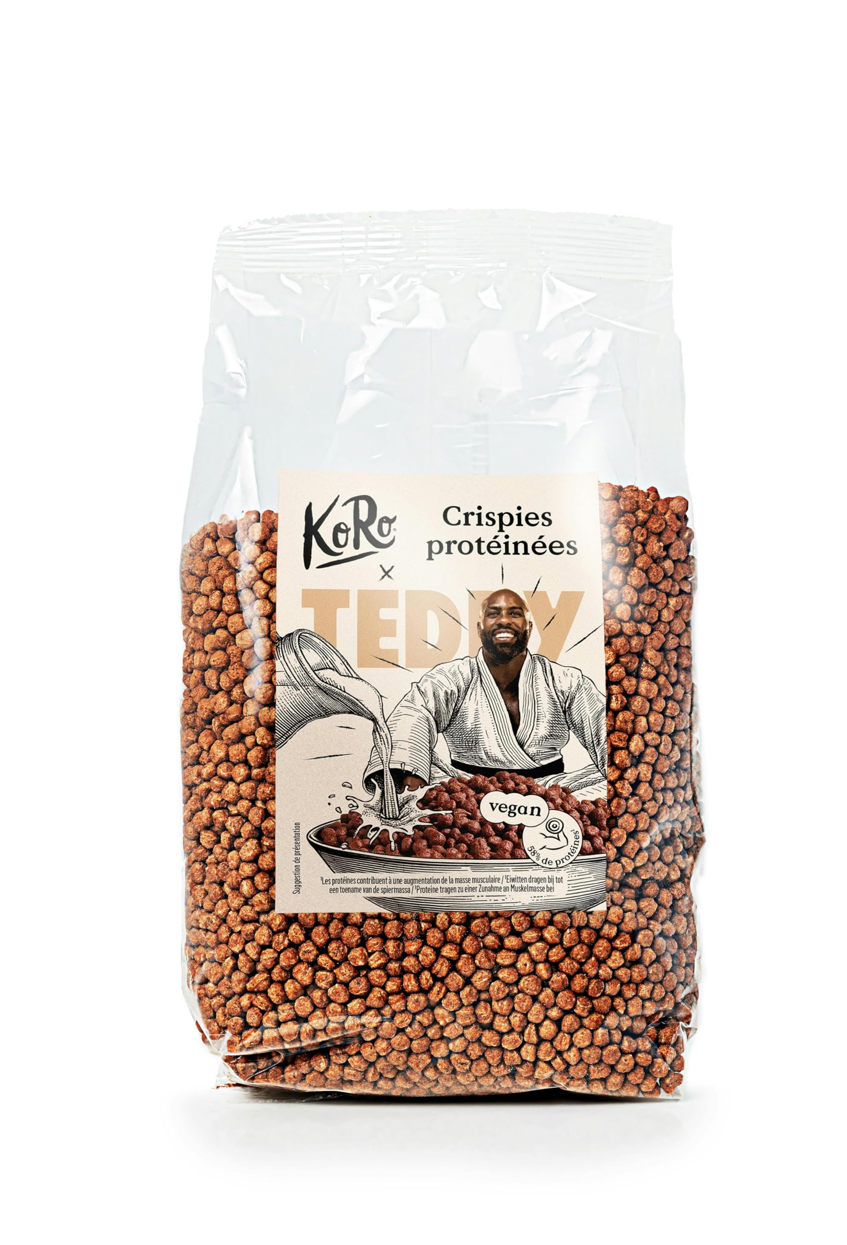 Soy-based. With cocoa. High in protein. Crispy balls. Teddy Riner x KoRo.A base de soja. Au cacao. Riches en protéines. Billes croustillantes. Teddy Riner x KoRo.KoRo - Crispies Protéinées au cacao x Teddy Riner 250 g