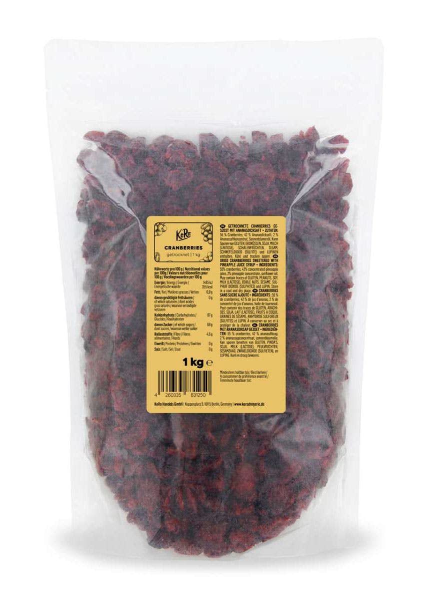 KoRo's dried cranberries do not contain the sugar that is usually added and are instead sweetened with pineapple syrup and pineapple juice concentrate. The small, sweet berries go well with muesli, porridge and yogurt, but they also go wonderfully with couscous, salad and curry. Cranberries also work well when baking. How about cookies, fruitcakes or energy balls In the 1 kg pack, the supply is secure for an extra long time! So healthy, so good - true to this motto, KoRo offers favorite foods in bulk. This not only saves packaging material and costs, but also ensures long-term benefit from innovative snacks, superfoods and proven cooking and baking ingredients. The Berlin-based company is constantly trying to expand its product range and buy as close as possible to the source. INGREDIENTS 55 cranberries, 42 pineapple concentrate, 2 concentrated pineapple juice, sunflower oil - May contain traces of GLUTEN, SOY, PEANUTS, MILK (LACTOSE), NUTS, SESAME and SULFUR DIOXIDE (SULPHITES). DIRECTIONS FOR USE Store in a cool, dry place, away from heat. SAFETY WARNING May contain traces of GLUTEN, SOY, PEANUTS, MILK (LACTOSE), NUTS, SESAME and SULFUR DIOXIDE (SULPHITES). PRINCIPLES: At KoRo, we have made it our mission to provide you with the best quality at fair prices in large packages. That's why we offer you your favorite products in 1 kg packs!. FOR YOU: You may already know apple or grape juice as a natural sweetener for dried fruits. Our natural cranberries are sweetened with pineapple juice and are ideal for vegan and vegetarian diets. PRICELESS: Our cranberries have a great taste and are full of goodness. VERSATILITY: Cranberries, just like goji berries or raisins, are a great snack for any occasion, whether on the road or during breaks at work and school. They are delicious in muesli, smoothies or desserts and add a vibrant touch of red!. NATURAL: Our dried cranberries bring nature into your kitchen! They are made without sulfur, added sugar, artificial flavors, flavor enhancers, or preservatives. 100 natural dried berries! Les cranberries séchées de KoRo ne contiennent pas le sucre qui est habituellement ajouté et sont plutôt édulcorées avec du sirop d'ananas et du concentré de jus d'ananas. Les petites baies sucrées se marient bien avec le muesli, le porridge et le yaourt, mais elles s'harmonisent aussi à merveille avec le couscous, la salade et le curry. Les canneberges font également bonne figure lors de la cuisson. Que diriez-vous de cookies, de gâteaux aux fruits ou de boules d'énergie Dans le pack de 1 kg, l'approvisionnement est sécurisé pour une durée extra longue ! Si sain, si bon - fidèle à cette devise, KoRo propose des aliments préférés en vrac. Cela permet non seulement d'économiser du matériel d'emballage et des coûts, mais garantit également de profiter à long terme de snacks innovants, de superaliments et d'ingrédients de cuisine et de pâtisserie éprouvés. L'entreprise berlinoise essaie constamment d'élargir sa gamme de produits et d'acheter au plus près de la source. INGRÉDIENTS 55 cranberries, 42 concentré d'ananas, 2 jus d'ananas concentré, huile de tournesol - Peut contenir des traces de GLUTEN, SOJA, ARACHIDES, LAIT (LACTOSE), FRUITS À COQUE, SÉSAME et DIOXYDE DE SOUFRE (SULFITES). MODE D'EMPLOI À conserver dans un endroit frais et sec, à l'abri de la chaleur. AVERTISSEMENT DE SÛRETÉ Peut contenir des traces de GLUTEN, SOJA, ARACHIDES, LAIT (LACTOSE), FRUITS À COQUE, SÉSAME et DIOXYDE DE SOUFRE (SULFITES). PRINCIPES : Chez KoRo, nous nous sommes donné pour mission de vous fournir la meilleure qualité à des prix équitables dans des emballages en grand format. C'est pourquoi nous vous offrons vos produits préférés en paquet de 1 kg !. POUR VOUS : Vous connaissiez peut-être le jus de pomme ou de raisin en tant qu'édulcorant naturel pour fruits secs Nos canneberges naturelles sont sucrées au jus d'ananas et sont idéales pour les régimes végétaliens et végétariens. INESTIMABLE : Nos cranberries ont un super goût et pleins de qualités. POLYVALENCE : Les cranberries, tout comme les baies de goji ou les raisins secs, sont un excellent en-cas pour toutes les occasions, que ce soit sur la route ou lors de pauses au travail et à l'école. Elles sont délicieuses dans les mueslis, les smoothies ou les desserts et y apportent une touche de rouge éclatante !. NATUREL : Nos cranberries sechees font entrer la nature dans votre cuisine ! Elles sont fabriquées sans soufre, sans sucre ajouté, sans arômes artificiels, sans exhausteurs de goût, ni conservateurs. Des fruits rouges séchés 100 naturels !.