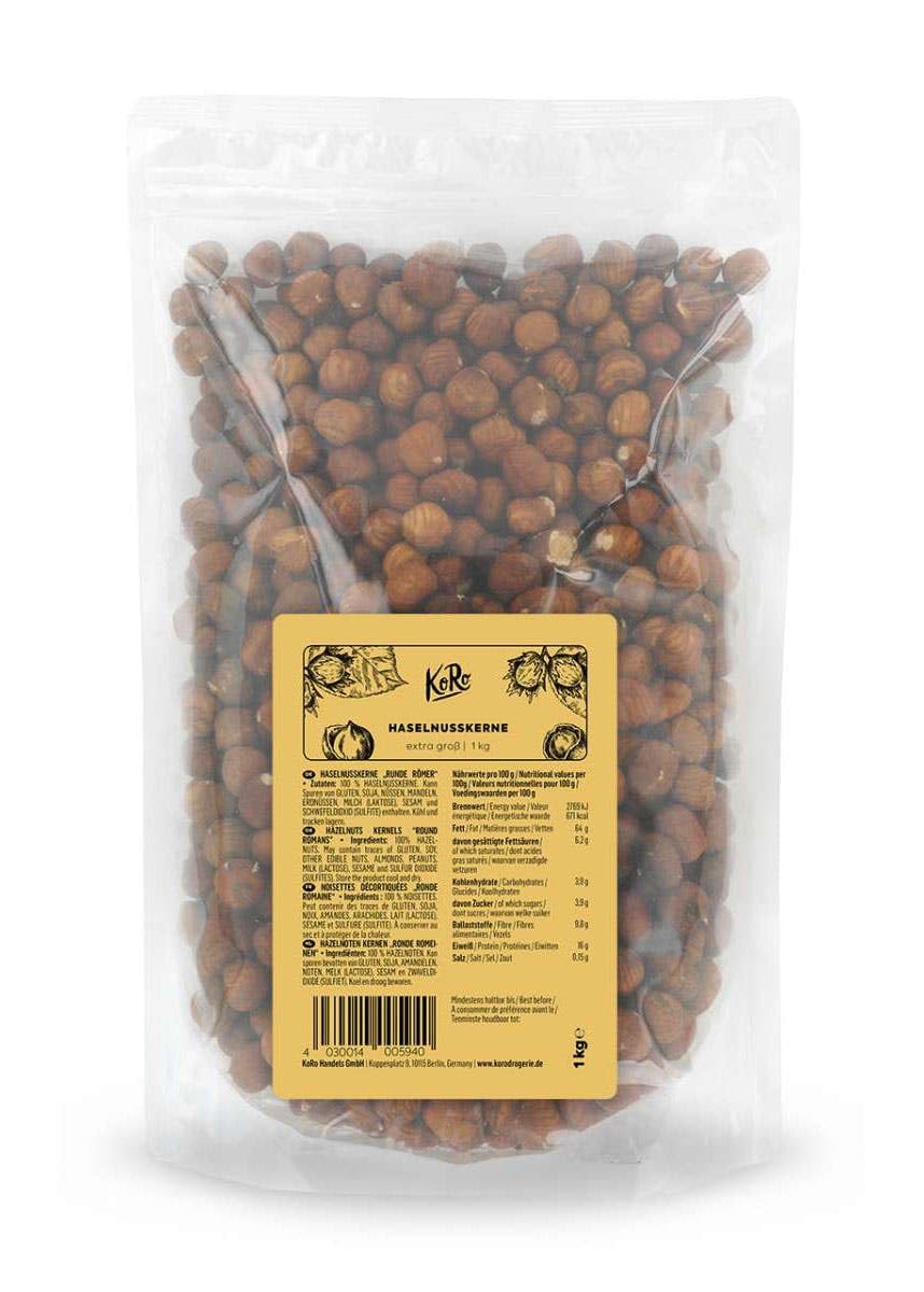 The hazelnut is the fruit of the hazelnut tree. This shrub is found in temperate zones of the Northern Hemisphere, in Asia, Europe and North America. Hazelnuts for sale usually come from Turkey or North America. Hazelnuts are a popular snack with very versatile uses. INGREDIENTS 100 HAZELNUTS - May contain GLUTEN, SOY, NUTS, ALMONDS, PEANUTS, MILK (LACTOSE), SESAME and SULFIDE (SULFITE). DIRECTIONS FOR USE Store in a cool, dry place and protect from light. SAFETY WARNING May contain GLUTEN, SOY, NUTS, ALMONDS, PEANUTS, MILK (LACTOSE), SESAME and SULFIDE (SULFITE). PRINCIPLES: At KoRo, we have made it our mission to provide you with the best quality at fair prices in large packaging. That's why we offer your products high-quality, sustainable packaging!. FOR YOU: Perfectly suitable for vegan and vegetarian diets. PRICELESS: Our whole and shelled nuts are free from any chemical additives such as artificial flavors, sulfur, preservatives, or sugar. They provide the body with important fatty acids. VERSATILITY: The shelled hazelnuts are neither salted nor sweetened, so they can be used variably in sweet and savory recipes. These lightly buttered treats are delicious and always keep well!. NATURAL: Our crunchy hazelnuts are natural and without flavor enhancers. These small snacks come in an economical package!. La noisette est le fruit du emnoisetierem. On retrouve cet arbuste dans les zones tempérées de l'hémisphère nord, en Asie, Europe et Amérique du Nord. Les noisettes destinées à la vente proviennent généralement de Turquie ou d'Amérique du Nord. Les noisettes sont une collation très appréciée aux utilisations très polyvalentes. INGRÉDIENTS 100 NOISETTES - Peut contenir GLUTEN, SOJA, NOIX, AMANDES, ARACHIDES, LAIT (LACTOSE), SÉSAME et SULFURE (SULFITE). MODE D'EMPLOI À conserver dans un endroit frais et sec et protéger de la lumière. AVERTISSEMENT DE SÛRETÉ Peut contenir GLUTEN, SOJA, NOIX, AMANDES, ARACHIDES, LAIT (LACTOSE), SÉSAME et SULFURE (SULFITE). PRINCIPES : Chez KoRo, nous nous sommes donné pour mission de vous fournir la meilleure qualité à des prix équitables dans des emballages grand format. C'est pourquoi nous offrons à vos produits des emballages durables de qualité !. POUR VOUS : Convient parfaitement pour les régimes vegans et végétariens. INESTIMABLE : Nos noix entières et décortiquées sont exemptes de tout additif chimique tel que les arômes artificiels, le soufre, les conservateurs ou le sucre. Elles fournissent à l'organisme des acides gras importants. POLYVALENCE : Les noisettes décortiquées ne sont ni salées ni sucrées et peuvent donc être utilisées de manière variable dans les recettes sucrées et salées. Ces douceurs légèrement beurrées sont délicieuses et se conservent toujours bien !. NATUREL : Nos noisettes croquantes sont naturelles et sans exhausteurs de goût. Ces petites collations sont proposées dans un emballage économique !.