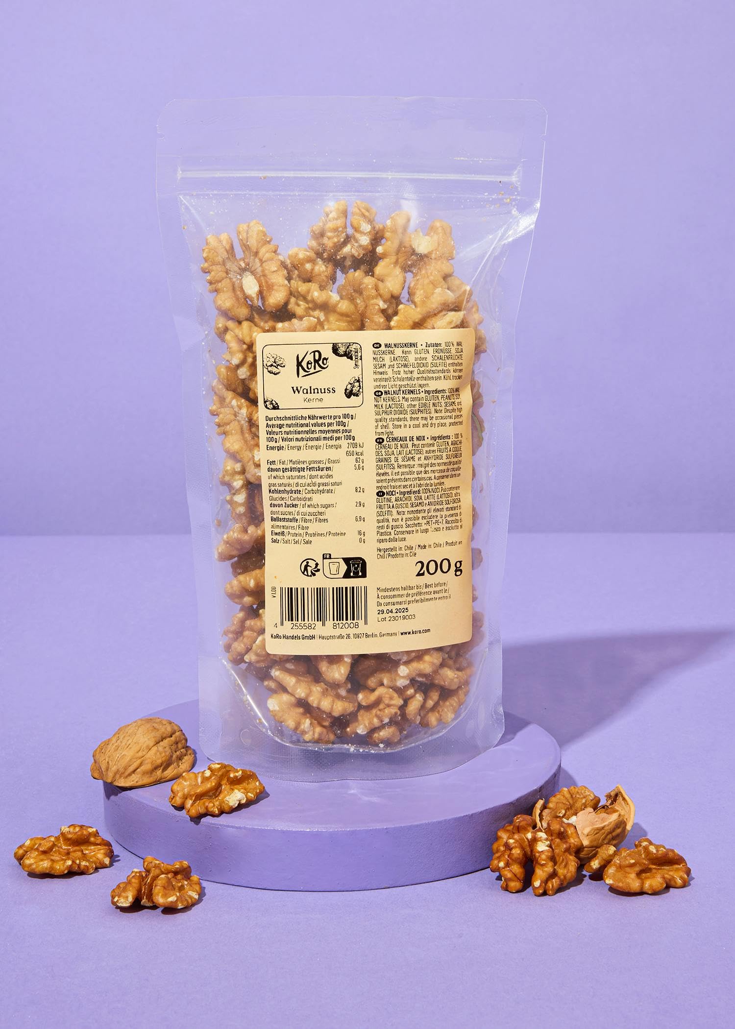 For cooking, baking and as a snack: our walnut kernels ✓ Intense taste ✓ Large and extra light ✓ 200g size – buy now! INGREDIENTS 100 WALNUT KERNELS - May contain GLUTEN, PEANUTS, SOY, MILK (LACTOSE), other NUTS, SESAME and SULPHUR DIOXIDE (SULPHITES). May contain GLUTEN, PEANUTS, SOY, MILK (LACTOSE), other NUTS, SESAME and SULPHUR DIOXIDE (SULPHITES). DIRECTIONS FOR USE Store in a cool, dry place away from light SAFETY WARNING Store in a cool, dry place away from heat. PRACTICAL 200g PACK: This way you can test whether the large, extra light walnut kernels are to your liking before purchg them in our practical 1kg pack. FOR YOU: Natural walnut kernels are of the best quality. They are also ideal for vegans and vegetarians. VALUABLE: Our walnut kernels are free from any chemical additives such as artificial flavors, sulfur, preservatives, or added sugar . VERSATILE: Walnuts are perfect for breakfast, in savory and sweet recipes, or as a snack. NATURAL: Our crunchy, thin walnut kernels are raw, natural, and free from artificial flavor enhancers. Pour la cuisine, la pâtisserie et comme snack : nos cerneaux de noix ✓ Goût intense ✓ Grandes et extra légères ✓ Format 200 g – achetez maintenant ! INGRÉDIENTS 100 CERNEAUX DE NOIX - Peut contenir du GLUTEN, des ARACHIDES, du SOJA, du LAIT (LACTOSE), d'autres FRUITS À COQUE, DU SÉSAME et du DIOXYDE DE SOUFRE (SULFITES). Peut contenir du GLUTEN, des ARACHIDES, du SOJA, du LAIT (LACTOSE), d'autres FRUITS À COQUE, DU SÉSAME et du DIOXYDE DE SOUFRE (SULFITES). MODE D'EMPLOI A conserver au frais et au sec à l'abri de la lumière AVERTISSEMENT DE SÛRETÉ À conserver dans un endroit frais et sec, à l'abri de la chaleur. FORMAT PRATIQUE DE 200 g : Vous pouvez ainsi tester si les gros cerneaux de noix extra légers sont à votre goût avant de les acheter dans notre paquet pratique de 1 kg. POUR VOUS : Les cerneaux de noix naturels sont de la meilleure qualité. Ils sont également idéaux pour les végétaliens et végétariens. PRÉCIEUX : Nos cerneaux de noix sont exempts de tout additif chimique tel que des arômes artificiels, du soufre, des conservateurs ou du sucre ajouté . POLYVALENT : Les noix sont parfaites au petit-déjeuner, dans des recettes salées et sucrées, ou comme snack. NATUREL : Nos cerneaux de noix croquants et fins sont crus, naturels et sans exhausteurs de goût artificiels.