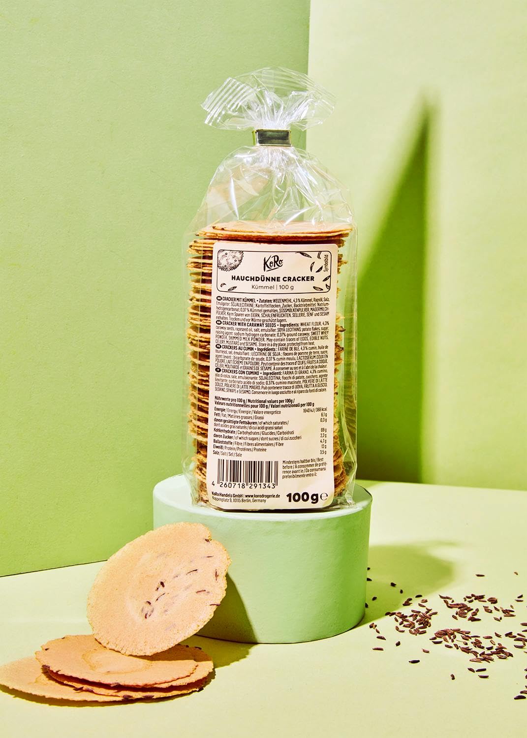KoRo - Hauchd nne Cracker K mmel 100g - With K mmel verfeinert - Knusprig - Tolle Abwechslung zu herk mmlichen Snacks