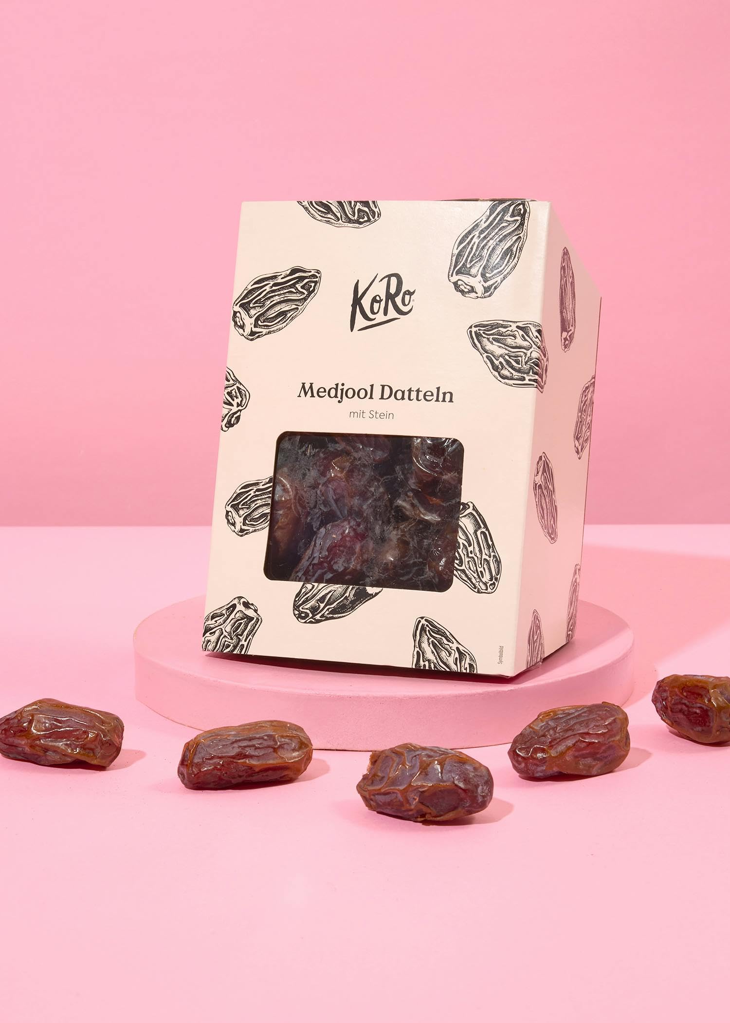 Die saftig-süßen Medjool-Datteln von KoRo überzeugen mit ihrem zarten Fruchtfleisch und ihrem karamelligen Geschmack. If it is soft, it has some sugar and ballast content (7 g 100 g). Ob pur, mit Nussmus oder in Salatkreationen: Die Medjool-Datteln mit Stein sind ein saftig-sweeter Allrounder und deswegen direkt in der 1 kg-Vorteilspackung erhältlich. So old, so gut – free nach diesem Motto bietet KoRo Lieblingslebensmittel in Grosspackungen an. Das part nicht nur Verpackungsmaterial und Kosten, sondern guaranert außerdem langfristigen Genuss von innovativen Snacks, Superfoods und altbewährten Koch- und Backzutaten. This is why Berliner Unternehmen stetig, seine Produktpalette zu erweitern und dabei so nah wie möglich am Ursprung einzukaufen. INGREDIENTS 100 Medjool dates - DIRECTIONS FOR USE Store in a cool and dry place PRINCIPLES: More is simply more! That's why KoRo products are available in value packs: fill your pantry and treat your wallet!. FOR YOU: Who can say no to soft and tender Medjool dates? That's why KoRo sells the dates directly in large packs at a special price. QUALITY: KoRo Medjool dates are the ideal snack: they are completely natural, without additives, and are also rich in fiber (7 g 100 g). Thanks to their particularly juicy consistency and caramel flavor, the fruits are a real delight. VERSATILE: Medjool dates are pure pleasure when you're in the mood for something sweet. For the ultimate taste experience, combine the dates with your favorite nut butter. The sweetness of the dates also goes well with savory dishes such as couscous or goat cheese salads. NATURAL: KoRo pitted Medjool dates are sun-ripened. They require no additives. Die saftig-süßen Medjool-Datteln von KoRo überzeugen mit ihrem zarten Fruchtfleisch und ihrem karamelligen Geschmack. Sie sind soft, ohne Zusätze und ballaststoffreich (7 g 100 g). Ob pur, mit Nussmus oder in Salatkreationen: Die Medjool-Datteln mit Stein sind ein saftig-sweeter Allrounder und deswegen direkt in der 1 kg-Vorteilspackung erhältlich. So viel, so gut – frei nach diesem Motto bietet KoRo Lieblingslebensmittel in Großpackungen an. Das spart nicht nur Verpackungsmaterial und Kosten, sondern garantiert außerdem langfristigen Genuss von innovativen Snacks, Superfoods und altbewährten Koch- und Backzutaten. Dabei versucht das Berliner Unternehmen stetig, seine Produktpalette zu erweitern und dabei so nah wie möglich am Ursprung einzukaufen. INGRÉDIENTS 100 dattes Medjool - MODE D'EMPLOI A conserver au frais et au sec PRINCIPES : Plus, c'est tout simplement plus ! C'est pourquoi les produits KoRo sont disponibles en packs économiques : remplissez votre garde-manger et faites plaisir à votre portefeuille !. POUR VOUS : Qui peut dire non aux dattes Medjool tendres et moelleuses C'est pourquoi KoRo vend les dattes directement en grand paquet à un prix spécial. QUALITE : Les dattes Medjool de KoRo sont le snack idéal : elles sont entièrement naturelles, sans additifs et sont également riches en fibres (7 g 100 g). Grâce à leur consistance particulièrement juteuse et leur saveur de caramel, les fruits sont un véritable délice. POLYVALENT : Les dattes Medjool sont un pur plaisir quand on a envie de quelque chose de sucré. Pour une expérience gustative ultime, combinez les dattes avec votre beurre de noix préféré. La douceur des dattes s'harmonise également avec les plats salés comme le couscous ou les salades au chèvre. NATUREL : Les dattes Medjool dénoyautées de KoRo mûrissent au soleil. Ils ne nécessitent aucun additif.