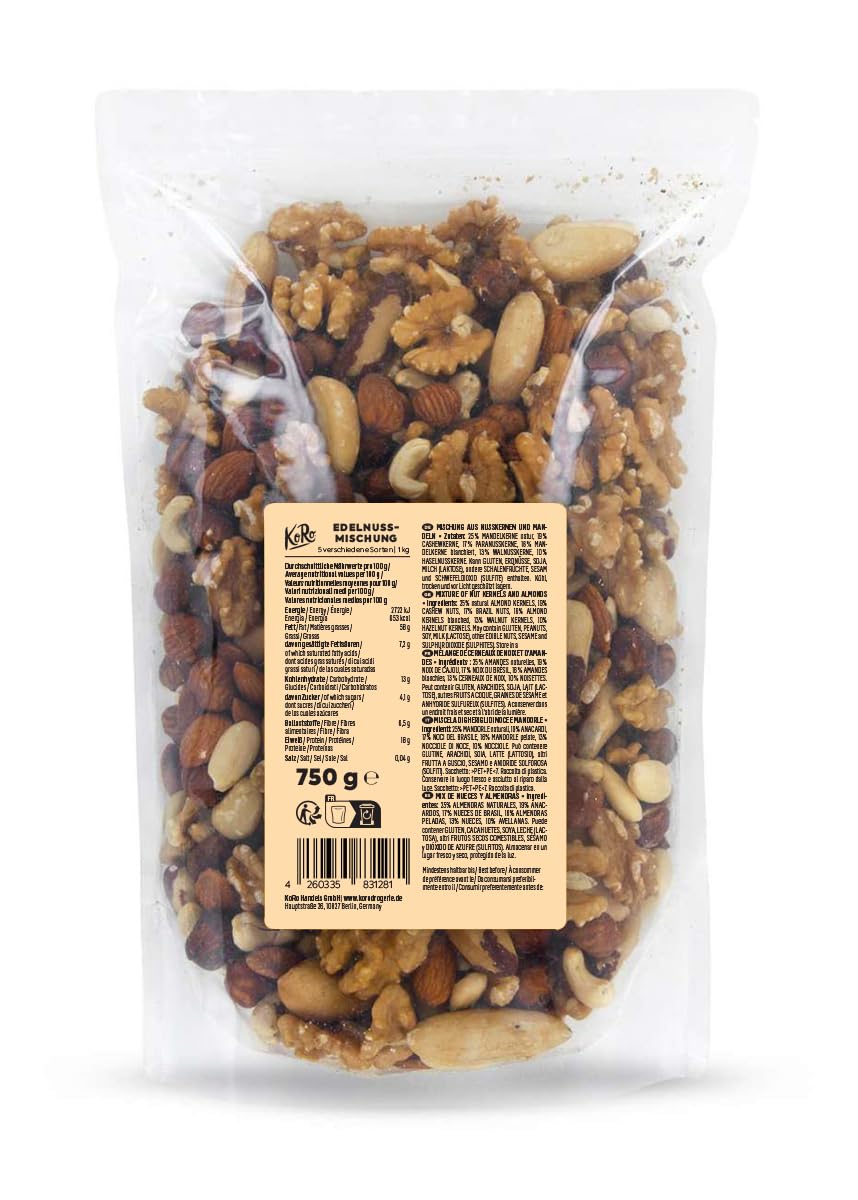 We offer you a mix of different high quality nuts. INGREDIENTS 25 Natural ALMONDS, 19 CASHEW NUTS, 17 BRAZIL NUTS, 16 Blanched ALMONDS, 13 WALNUTS, 10 HAZELNUTS - May contain GLUTEN, PEANUTS, SOY, MILK (LACTOSE), other NUTS, SESAME and SULFUR DIOXIDE (SULFITES). May contain GLUTEN, PEANUTS, SOY, MILK (LACTOSE), other NUTS, SESAME and SULFUR DIOXIDE (SULFITES). DIRECTIONS FOR USE Store in a cool, dry place and protect from light. SAFETY WARNING Store in a cool, dry place away from heat. PRINCIPLES: At KoRo, we've made it our mission to provide you with the best quality dried fruits at fair prices in large-format packaging. That's why we offer you your favorite products in 1 kg format! FOR YOU: Perfectly suitable for vegan and vegetarian diets. PRICELESS: Our cocktail of nuts and dried fruits is rich in fiber and vitamins and is perfectly suited to baking. You can therefore bake our fresh nuts to make nut bread and all kinds of cakes and pastries. VERSATILITY: You're not a fan of raisins? Our dried fruit mix contains only organic almonds, organic Brazil nuts, organic cashew nuts, organic hazelnuts, organic blanched almonds and organic walnuts, making it an ideal healthy snack for your aperitifs or after sports. You can take them anywhere and snack on them at any time of the day! NATURAL: Our organic nut and dried fruit mix is 100 natural. This nut mix is sugar-free, salt-free, and contains no artificial colors or preservatives. All our dried fruits are sourced from certified organic farming. Nous vous proposons un mélange de différentes noix de grande qualité. INGRÉDIENTS 25 AMANDES naturelles, 19 NOIX DE CAJOU, 17 NOIX DU BRÉSIL, 16 AMANDES mondées, 13 NOIX DE NOIX, 10 NOISETTES - Peut contenir du GLUTEN, des ARACHIDES, du SOJA, du LAIT (LACTOSE), d'autres FRUITS À COQUE, du SÉSAME et du DIOXYDE DE SOUFRE (SULFITES). Peut contenir du GLUTEN, des ARACHIDES, du SOJA, du LAIT (LACTOSE), d'autres FRUITS À COQUE, du SÉSAME et du DIOXYDE DE SOUFRE (SULFITES). MODE D'EMPLOI A conserver au frais et au sec et à protéger de la lumière. AVERTISSEMENT DE SÛRETÉ À conserver dans un endroit frais et sec, à l'abri de la chaleur. PRINCIPES : Chez KoRo, nous nous sommes donné pour mission de vous fournir des fruits secs de la meilleure qualité à des prix équitables dans des emballages grand format. C'est pourquoi nous vous offrons vos produits préférés en format de 1 kg !. POUR VOUS : Convient parfaitement pour les régimes vegans et végétariens. INESTIMABLE : Notre cocktail de noix et fruits secs est riche en fibres et vitamines et supporte parfaitement la cuisson. Vous pouvez donc faire cuire nos noix fraiches pour réaliser du pain au noix et toutes sortes de gâteaux et pâtisseries. POLYVALENCE : Vous n'êtes pas fan des raisins secs Notre melange fruits secs contient uniquement des amandes bio, des noix du Brésil bio, des noix de cajou bio, des noisettes bio, des amandes blanchies bio et des noix bio, ce qui en fait un en cas-sain idéal pour vos apéritifs ou après le sport. Vous pouvez les emporter partout et les grignoter à tout moment de la journée !. NATUREL : Notre mélange de noix et fruits secs bio est 100 naturel. Ce mix de noix est sans sucre et sans sel et ne contient aucun colorants, ni conservateurs. Tous nos fruits sec sont issus de l'agriculture biologique contrôlée.