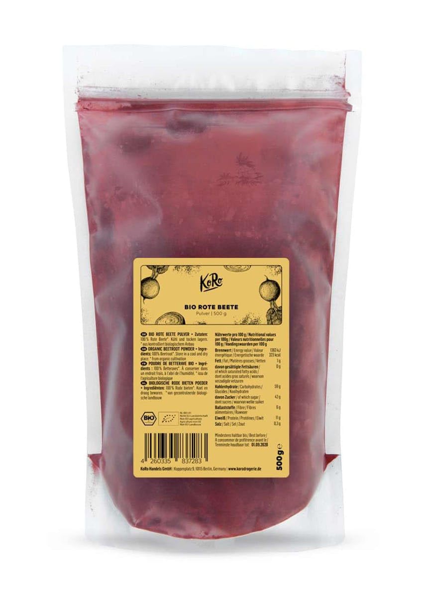 No more beetroot stains on your clothes or stained hands for days. With our beetroot powder, we take this worry off your hands. The powder is obtained through a drying process, once the beetroot juice has been extracted. It is, of course, additive-free. It is not just a red powder it also enriches your dishes with minerals and vitamins. Its taste is slightly sweet and spicy at the same time. INGREDIENTS 100 beetroot from organic farming - May contain traces of GLUTEN, SOY, NUTS and SESAME. May contain traces of GLUTEN, SOY, NUTS and SESAME. DIRECTIONS FOR USE Store in a cool, dry place away from light. SAFETY WARNING Store in a cool, dry place away from heat. PRINCIPLES: At KoRo, we are committed to providing you with the best quality at fair prices in large-format packaging. That's why we offer your favorite products quality sustainable packaging!. FOR YOU: The natural powder of the super tuber is gently extracted from the beet juice through a drying process. This preserves its intense color and subtle taste. PRICELESS: The beetroot powder comes from controlled organic farming. In addition, it is a great source of vitamins and minerals. VERSATILITY: This red powder is a wonder for coloring food. Another advantage is that you can easily enrich your food and drinks with additional minerals and vitamins. ORGANIC: Our organic beetroot powder is free from preservatives, colorings, or other additives. It is made from 100 beets and retains its natural taste. Fini les tâches de betterave rouge sur les vêtements ou les mains colorées pendant des jours. Avec notre poudre de betterave, nous vous déchargeons de ce souci. La poudre est obtenue par un procédé de séchage, une fois le jus de la betterave extrait. Elle est bien sûr, sans additifs. Il ne s'agit pas d'une simple poudre de couleur rouge elle permet également d'enrichir vos plats en minéraux et vitamines. Son goût est légèrement sucré et relevé en même temps. INGRÉDIENTS 100 betteraves issues de l'agriculture biologique - Peut contenir des traces de GLUTEN, SOJA, FRUITS A COQUES et SESAME. Peut contenir des traces de GLUTEN, SOJA, FRUITS A COQUES et SESAME. MODE D'EMPLOI Conserver dans un endroit frais et sec, à l'abri de la lumière. AVERTISSEMENT DE SÛRETÉ À conserver dans un endroit frais et sec, à l'abri de la chaleur. PRINCIPES : Chez KoRo, nous nous engageons à vous fournir la meilleure qualité à des prix équitables dans des emballages grand format. C'est pourquoi nous offrons à vos produits préférés des emballages durables de qualité !. POUR VOUS : La poudre naturelle du super tubercule est délicatement extraite du jus de la betterave par un procédé de séchage. Cela permet de conserver sa couleur intense et le goût subtil. INESTIMABLE : La poudre de betterave provient d'une agriculture biologique contrôlée. De plus, elle est une grande source de vitamines et de minéraux. POLYVALENCE : Cette poudre rouge est une merveille pour la coloration des aliments. Un autre avantage est que vous pouvez facilement enrichir votre alimentation et vos boissons avec des minéraux et des vitamines supplémentaires. BIO : Notre poudre de betterave bio est exempte de conservateurs, de colorants ou d'autres additifs. Elle est composée à 100 de betteraves et conserve son goût naturel.