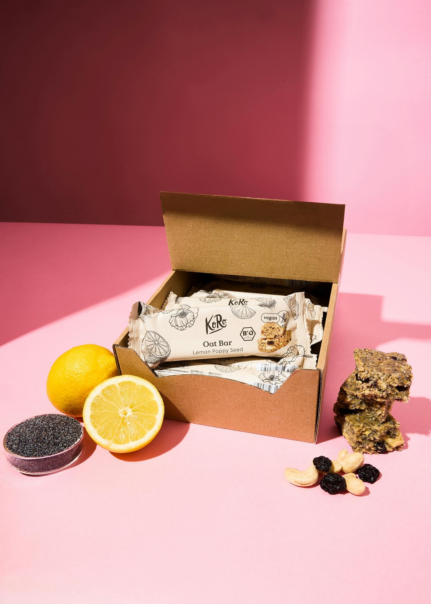 QUALITY: Our oat bar is gluten-free and sweetened with agave syrup instead of refined sugar. VEGAN: The oat bar is made from 100 plant-based ingredients and is therefore suitable for a vegan diet. RICH IN FIBER: Our organic oat bar contains 6g of fiber per bar (60g) and therefore has a high fiber content. VERSATILE: The bar is suitable as a snack for traveling, after sports, or as a fruity snack for work. ORGANIC: For our lemon poppy seed oat bar, we only use ingredients from organic farming.QUALITE : Notre barre de flocons d'avoine est sans gluten et sucrée avec du sirop d'agave au lieu du sucre raffiné. VÉGAN : La barre à l'avoine est composée à 100 d'ingrédients d'origine végétale et convient donc à un régime vegan. RICHE EN FIBRES : Notre barre d'avoine bio contient 6 g de fibres par barre (60 g) et a donc une teneur élevée en fibres. POLYVALENT : La barre convient comme snack pour les voyages, après le sport ou comme snack fruitée pour le travail. BIOLOGIQUE : Pour nos barre aux graines de pavot au citron et à l'avoine, nous utilisons uniquement des ingrédients issus de l'agriculture biologique.
