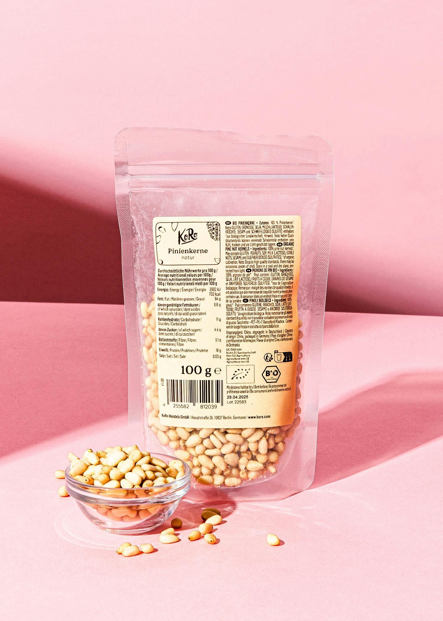 To make your kitchen more chic: our pine nuts ✓ Aromatic ✓ Organic quality ✓ Practical 100g pack – buy now! INGREDIENTS 100 pine nuts from organic farming - May contain GLUTEN, PEANUTS, SOY, MILK (LACTOSE), NUTS, SESAME and SULPHUR DIOXIDE (SULPHITES). May contain GLUTEN, PEANUTS, SOY, MILK (LACTOSE), NUTS, SESAME and SULPHUR DIOXIDE (SULPHITES). DIRECTIONS FOR USE Store in a cool, dry place away from light SAFETY WARNING Store in a cool, dry place away from heat. PRACTICAL TRIAL PACK: Pine nuts are offered to you in the practical 100g trial pack!. FINE: Our pine nuts will impress you with their consistency and flavor. VALUABLE: The white oblong seeds can take up to three years to ripen in the pine cones. VERSATILE: With their fine and wonderfully aromatic taste, our pine nuts are suitable for pesto or as a salad topping and can be used in both baked goods and stews. ORGANIC QUALITY: Our pine nuts are 100 organically grown. Pour rendre votre cuisine plus chic : nos pignons de pin ✓ Aromatique ✓ Qualité biologique ✓ Pack pratique de 100 g – achetez maintenant ! INGRÉDIENTS 100 pignons de pin issus de l'agriculture biologique - Peut contenir du GLUTEN, des ARACHIDES, du SOJA, du LAIT (LACTOSE), des NOIX, DU SÉSAME et du DIOXYDE DE SOUFRE (SULFITES). Peut contenir du GLUTEN, des ARACHIDES, du SOJA, du LAIT (LACTOSE), des NOIX, DU SÉSAME et du DIOXYDE DE SOUFRE (SULFITES). MODE D'EMPLOI A conserver au frais et au sec à l'abri de la lumière AVERTISSEMENT DE SÛRETÉ À conserver dans un endroit frais et sec, à l'abri de la chaleur. PACK D'ESSAI PRATIQUE : Les pignons de pin vous sont proposés dans le pack d'essai pratique de 100 g !. FINS : Nos pignons de pin vous impressionneront par leur consistance et leur saveur. PRÉCIEUX : Les graines oblongues blanches peuvent mettre jusqu'à trois ans à mûrir dans les pommes de pin. POLYVALENT : Avec leur goût fin et merveilleusement aromatique, nos pignons de pin conviennent au pesto ou comme garniture de salade et peuvent être utilisés aussi bien dans les pâtisseries que dans les mijotés. QUALITÉ BIO : Nos pignons de pin sont issus de l'agriculture 100 biologique.