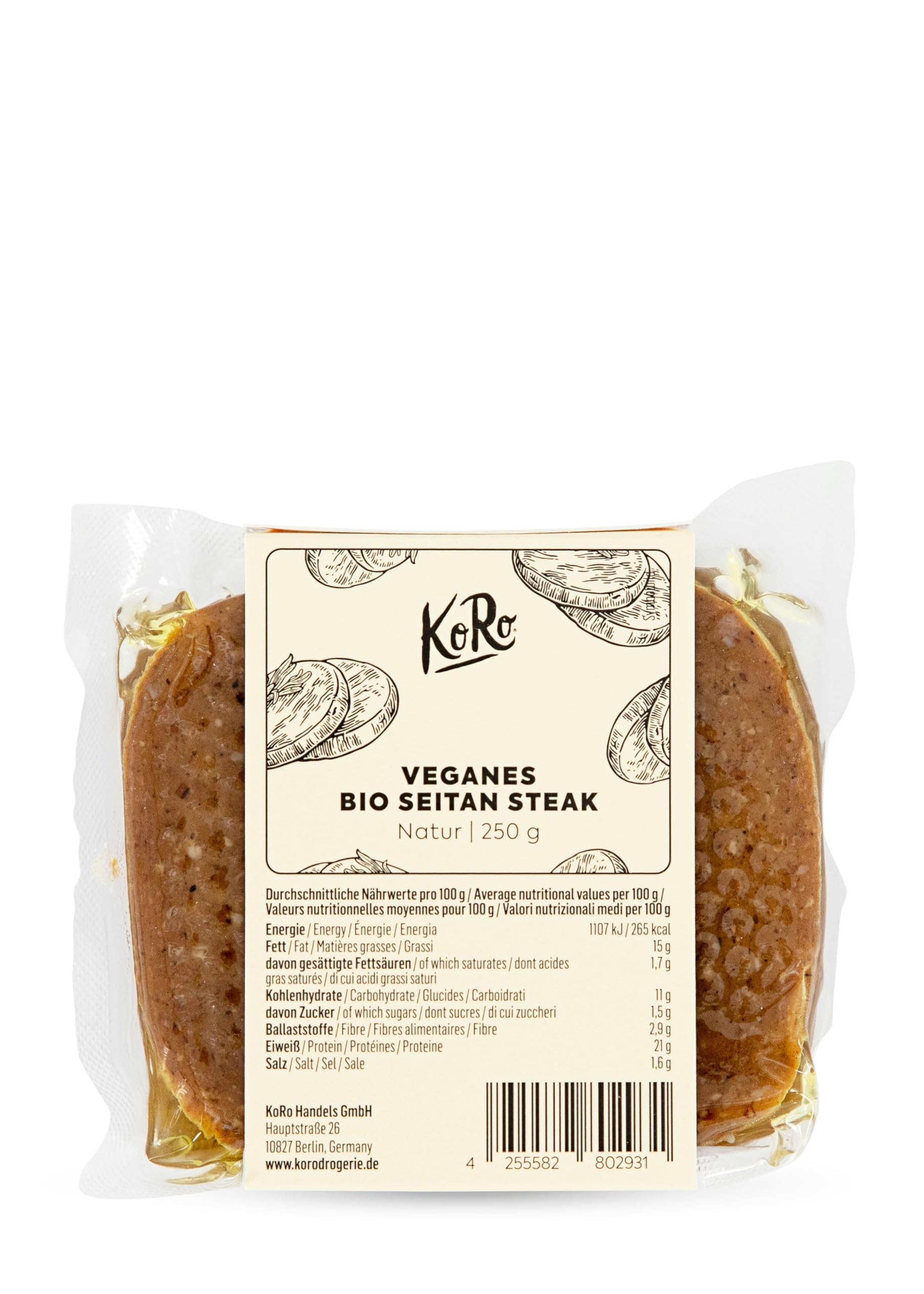 Can be stored without refrigeration until opened. Vegan steak. Rich in plant-based protein (21 g 100 g). Seitan-based meat substitute.Peut être stocké sans réfrigération avant ouverture. Steak vegan. Riche en protéines végétales (21 g 100 g). Substitut de viande à base de seitan.