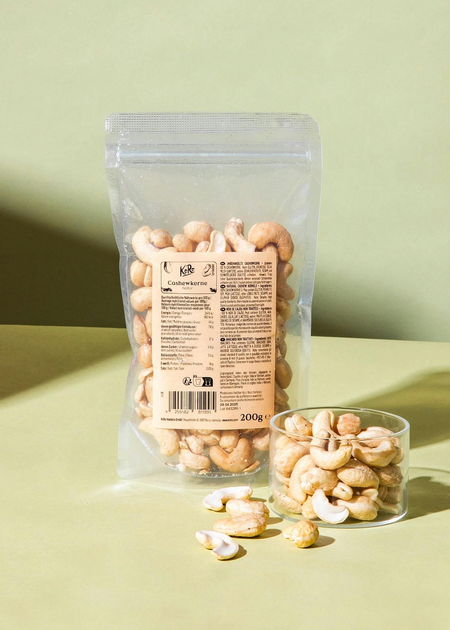 Our cashews are a kitchen essential! ✓ Versatile ✓ Source of fiber ✓ Crunchy – buy now! INGREDIENTS 100 CASHEW NUTS - May contain GLUTEN, PEANUTS, SOY, MILK (LACTOSE), other NUTS, SESAME and SULFUR DIOXIDE (SULFITES). May contain GLUTEN, PEANUTS, SOY, MILK (LACTOSE), other NUTS, SESAME and SULFUR DIOXIDE (SULFITES). DIRECTIONS FOR USE Store in a cool, dry place away from light SAFETY WARNING Store in a cool, dry place away from heat. CONVENIENT 200g PACK: Cashew nuts come in a cost-effective package! PREMIUM QUALITY: Our whole cashew nuts are of the finest quality. They are also ideal for vegan and vegetarian diets. NO ADDITIVES: Our shelled and whole cashew nuts are free from any additives and are therefore versatile. For those who want to keep things 100 natural, our cashew nuts are just what you need! VERSATILE: Cashew nuts contain no added sugar (they naturally contain sugar) and can therefore be used in both sweet and savory dishes. NATURAL: Our crunchy cashew nuts are natural and contain no artificial flavor enhancers. Nos noix de cajou sont un indispensable en cuisine ! ✓ Polyvalentes ✓ Source de fibres ✓ Croquantes – achetez maintenant ! INGRÉDIENTS 100 NOIX DE CAJOU - Peut contenir du GLUTEN, des ARACHIDES, du SOJA, du LAIT (LACTOSE), d'autres FRUITS À COQUE, DU SÉSAME et du DIOXYDE DE SOUFRE (SULFITES). Peut contenir du GLUTEN, des ARACHIDES, du SOJA, du LAIT (LACTOSE), d'autres FRUITS À COQUE, DU SÉSAME et du DIOXYDE DE SOUFRE (SULFITES). MODE D'EMPLOI A conserver au frais et au sec à l'abri de la lumière AVERTISSEMENT DE SÛRETÉ À conserver dans un endroit frais et sec, à l'abri de la chaleur. FORMAT PRATIQUE DE 200 g : La noix de cajou est présentée dans un emballage économique !. QUALITÉ PREMIUM : Nos noix de cajou entières sont de la meilleure qualité. Elles sont également idéales pour les régimes vegan et végétariens. SANS ADDITIFS : Nos noix de cajou décortiquées et entières sont exemptes de tout additif et sont donc polyvalentes. Pour ceux qui veulent garder les choses 100 naturelles, nos noix de cajou sont exactement ce qu'il vous faut !. POLYVALENT : Les noix de cajou ne contiennent pas de sucre ajouté (elles contiennent naturellement du sucre) et peuvent donc être utilisées dans des plats sucrés et salés. NATURELLES : Nos noix de cajou croquantes sont naturelles et ne contiennent aucun exhausteur de goût artificiel.